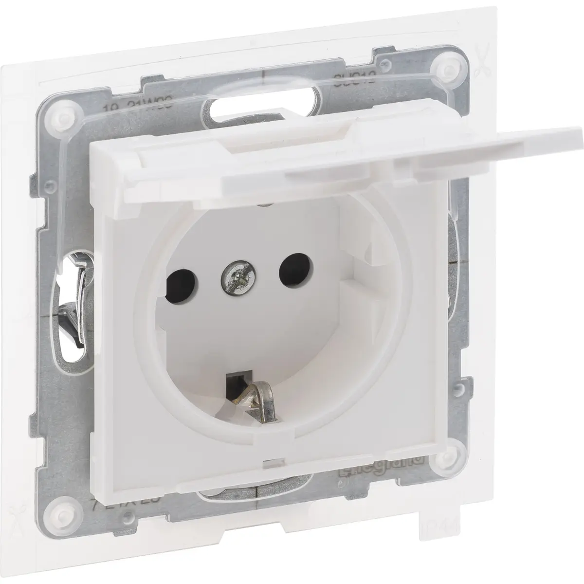 Tomada Schuko com proteção IP44 e tampa integrada; dispõe de ligadores automáticos, obturadores de proteção e suporte metálico. O mecanismo permite fixação por parafusos ou por garras, incluindo as peças necessárias. Compatível com quadros de acabamento, ideal para instalações seguras em ambientes húmidos, com instalação rápida, durabilidade e proteção de contacto.