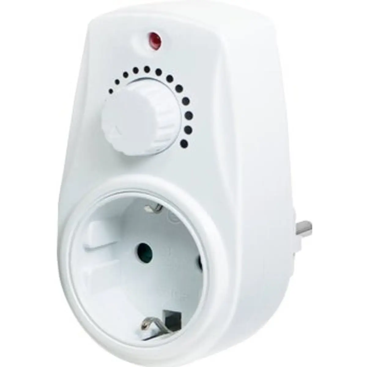 Tomada Schuko com regulador de intensidade (dimmer) que suporta até 280W a 230V. Adequada para lâmpadas de halogénio, oferece controlo preciso da luminosidade no interior. Possui acabamento branco e dimensões de 50 x 90 mm, facilitando a instalação em tomadas padrão. Ideal para ajustar o brilho de iluminação sem trocar lâmpadas, assegurando conforto visual e economia de energia.
