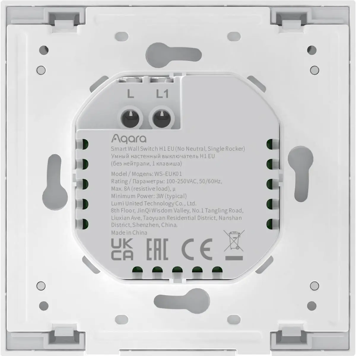 O Aqara Smart Wall Switch H1 EU (No Neutral, Single Rocker) (WS-EUK01) é um interruptor inteligente de parede com um relé de canal único e com controlo baseado no protocolo de comunicação sem fio Zigbee 3.0.