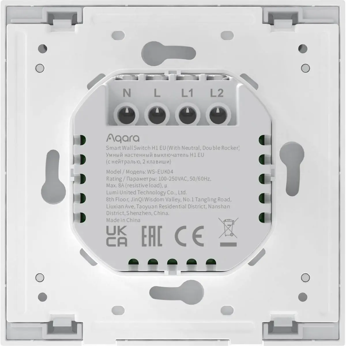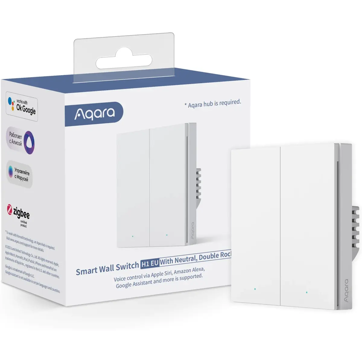 O Aqara Smart Wall Switch H1 EU (With Neutral, Double Rocker) (WS-EUK04) é um interruptor inteligente de parede duplo (com dois relés) e com controlo baseado no protocolo de comunicação sem fio Zigbee 3.0.