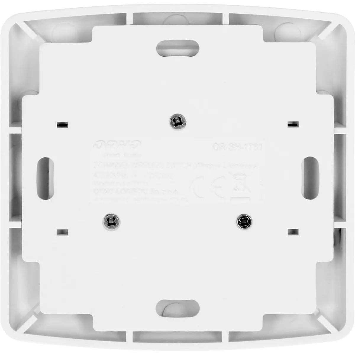 Interruptor duplo de superfície sem fios, operando em RF a 433,92 MHz, com dois canais para controlo remoto de relés e tomadas. Compatível com Orno Smart Home (TUYA) e com assistentes Google e Alexa, permite montagem direta na parede sem caixa de junção. Alimentado por CR2032, sem Wi‑Fi e com alcance até 30 m em área aberta. Dimensões compactas (profundidade 16 mm, altura 80 mm) e classificação IP20, ideal para automação residencial.