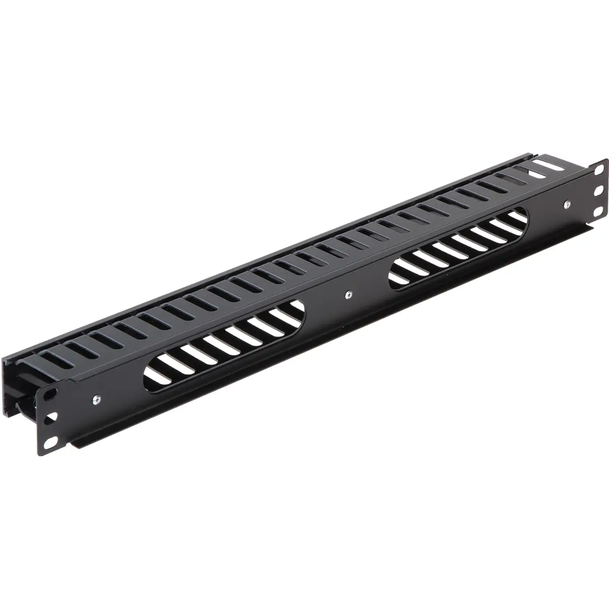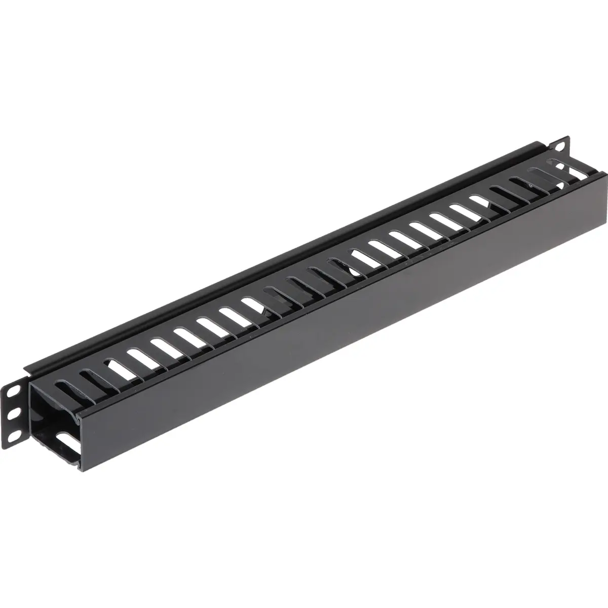 Este organizador de cabos para armário 19'' 1U, em metal preto, facilita a organização de cablagem em racks, oferecendo fixação estável, proteção contra danos durante a abertura e fecho do armário e separação de cabos para uma manutenção mais rápida. Com 24 portas de cabos, dimensões de 483 x 44 x 62 mm e peso de 0,38 kg, suporta gestão eficiente de cablagem em infraestruturas de rede. Ideal para centros de dados, salas técnicas e salas de comunicação, promovendo segurança e ordem.