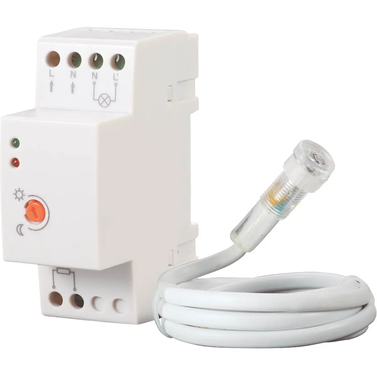 O dispositivo abre e fecha um circuito elétrico quando a intensidade da luz cai abaixo do nível ajustado. A sonda externa incluí 1 metro com cabo 2x0.5mm2 que pode ser prolongado. Para montagem em calha DIN.