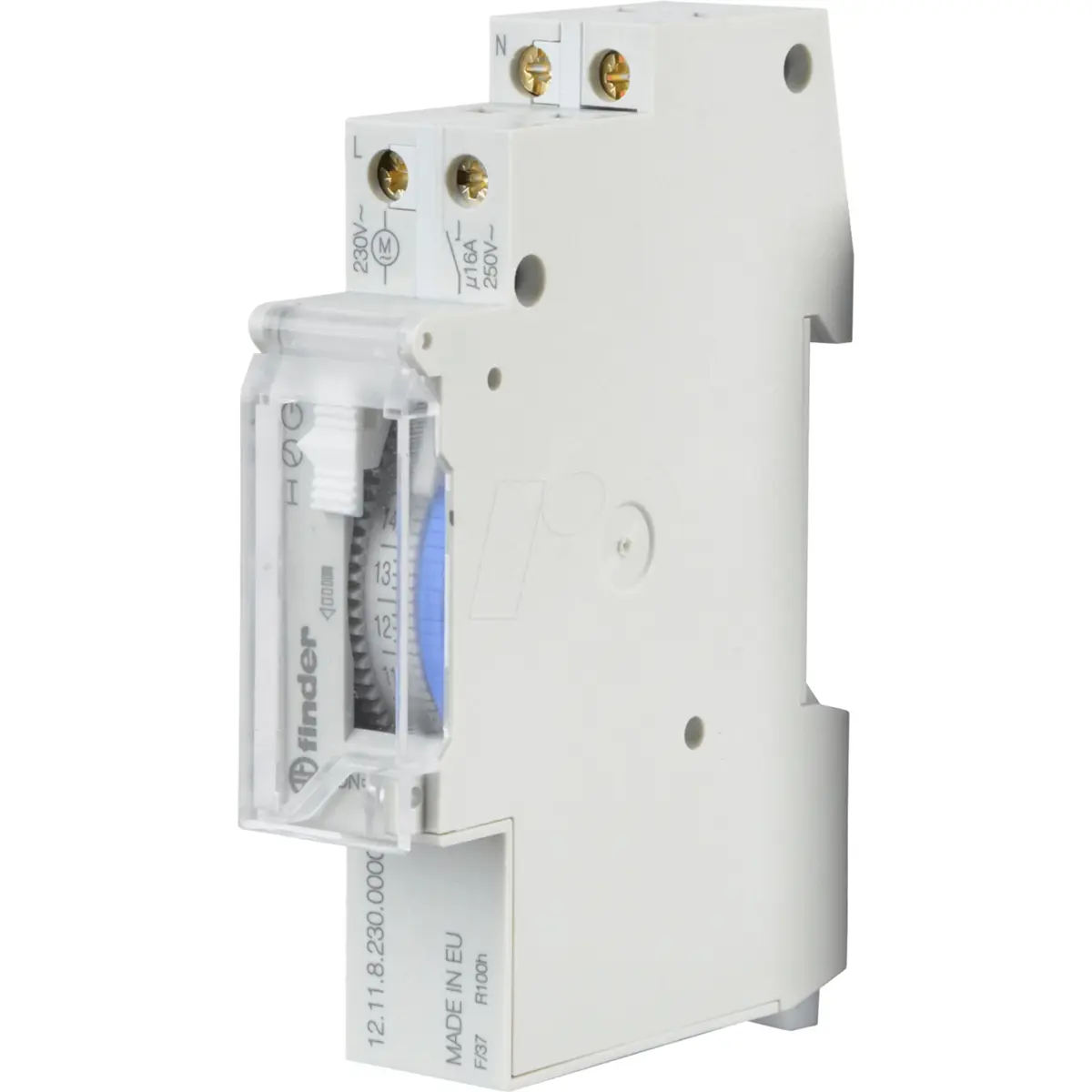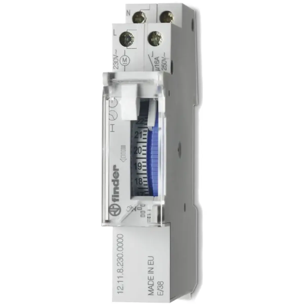 O Finder 12.11.8.230.0000 é um programador horário eletromecânico diário concebido para automatizar o funcionamento de equipamentos elétricos de forma simples e fiável. Permite controlar cargas até 16 A, possibilitando a ativação automática de iluminação, sistemas de climatização, vitrines, sinalização ou outros dispositivos elétricos conforme um programa definido.