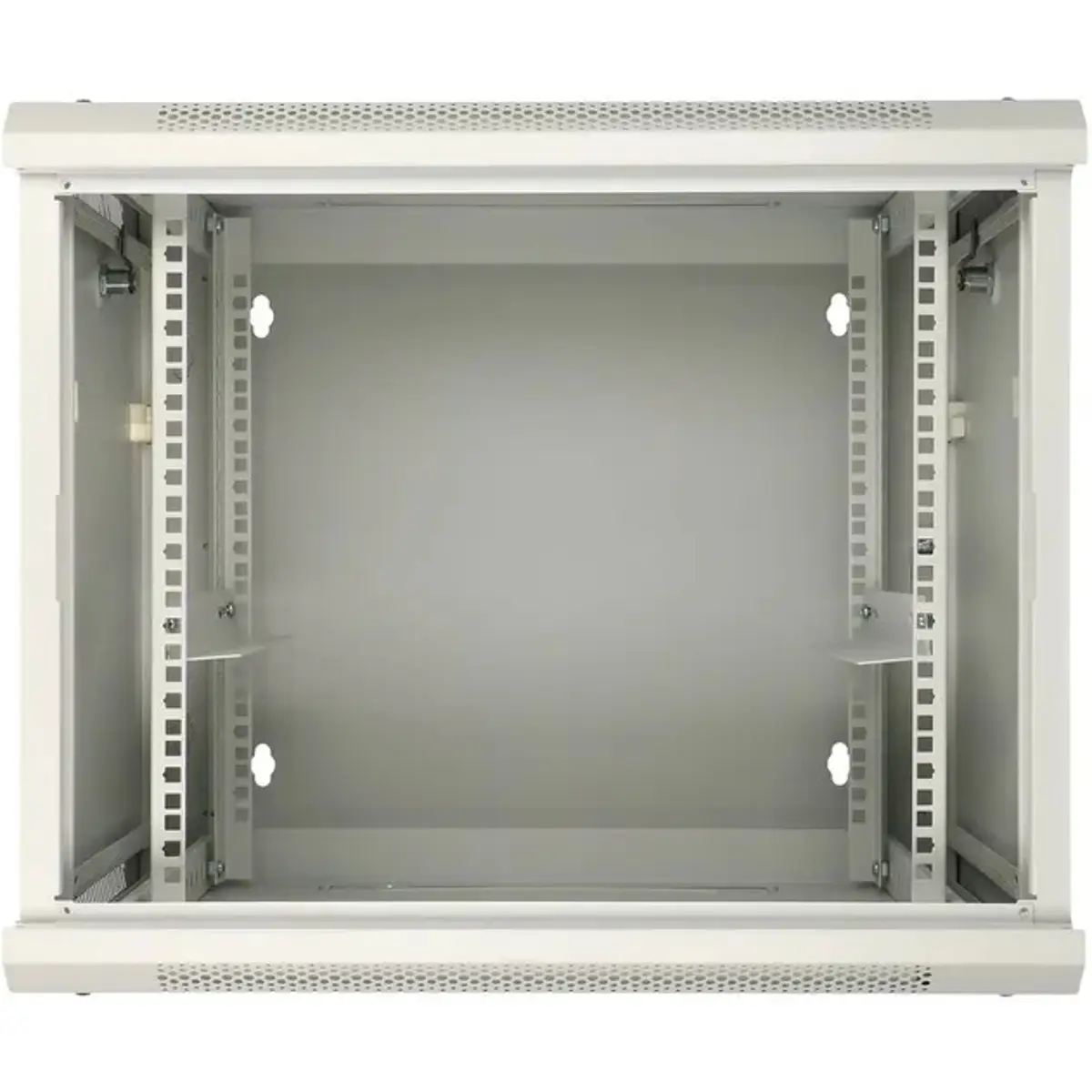 Armário bastidor de parede 19'' em aço laminado e vidro temperado, concebido para salas de servidor, rede ou CCTV. A construção em duas secções facilita o acesso traseiro aos componentes, com portas frontais de vidro temperado que abrem até 180 graus e fechadura com chave. Inclui painéis laterais amovíveis, entradas para cabos na tampa superior e no painel inferior, duas posições para ventoinhas no topo e passagens adicionais para cabos. Capacidade de carga até 60 kg, altura de 12U e dimensões externas de 600 x 750 x 640 mm. Vendido desmontado.