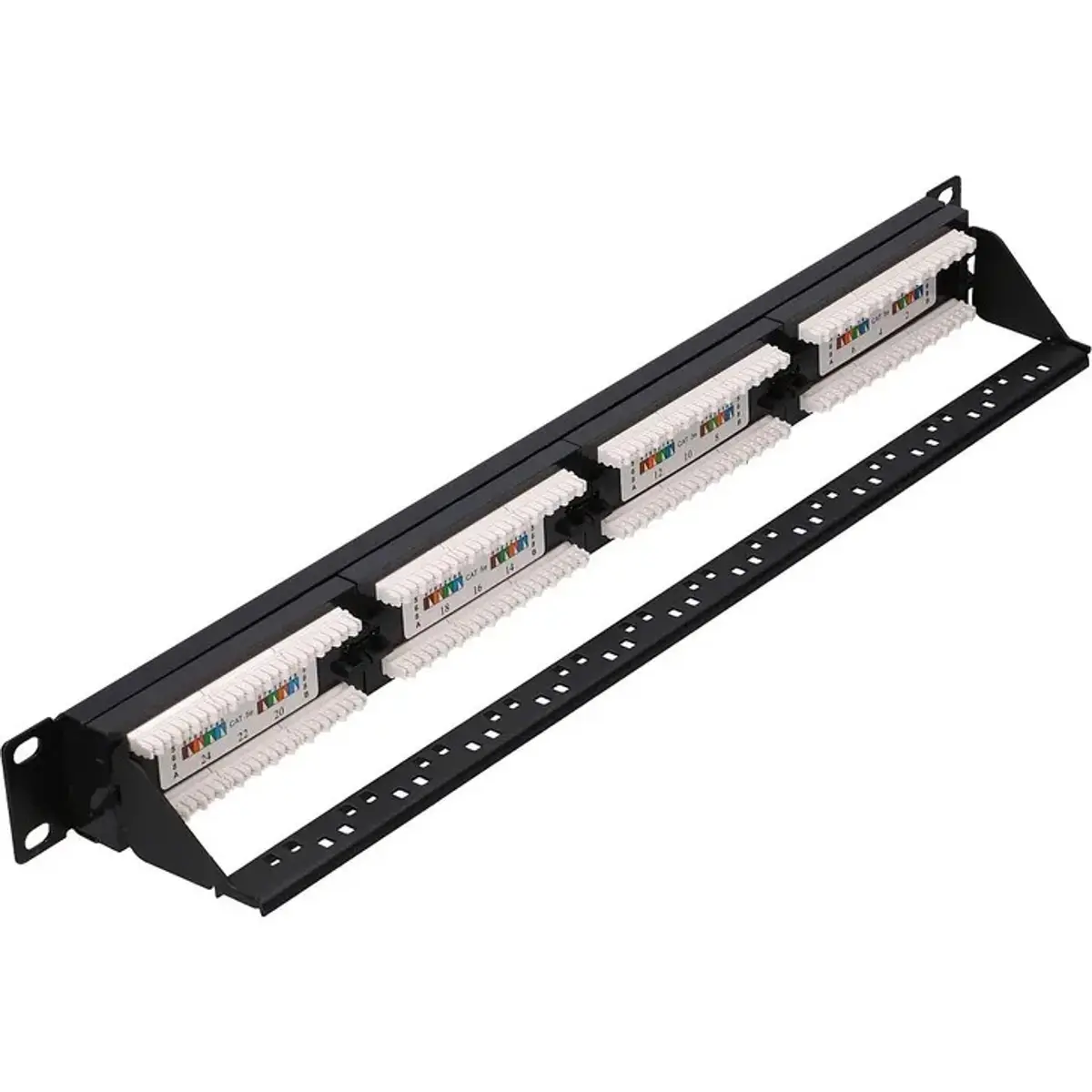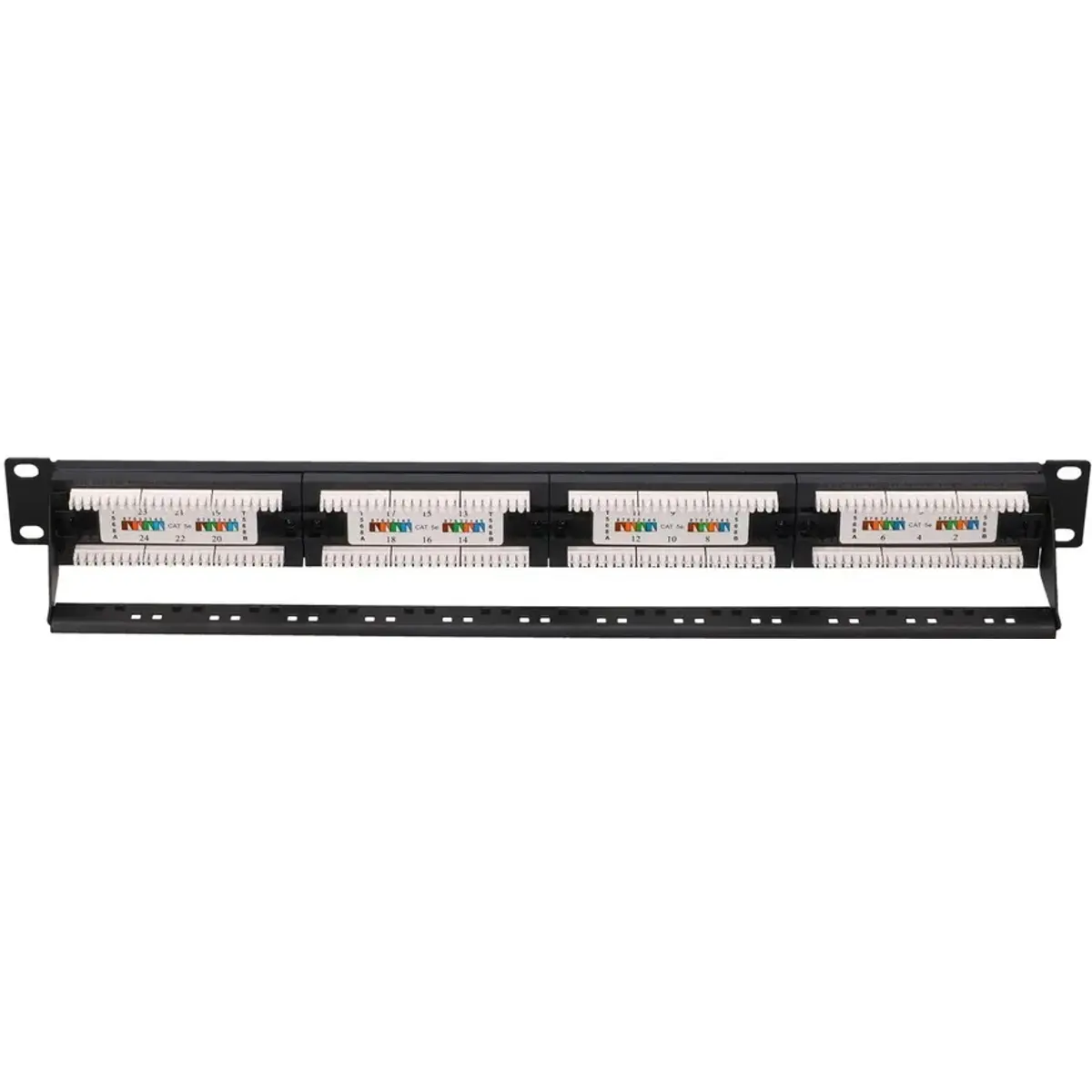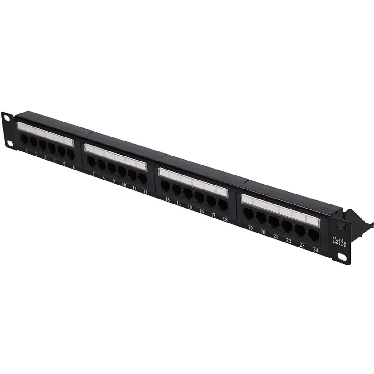 O patch panel de 24 portas RJ45 para rack de 19'' suporta comunicação 10/100/1000Base-T(X) com conectores Cat5e UTP e revestimento em cobre. Tem altura de 1U, é oferecido em branco e preto e possui apoio para fixação de cabos; não utiliza keystones. Ideal para organizar ligações em infraestruturas de rede, facilitando a gestão de cabos, a instalação em racks padrão e a escalabilidade de redes gigabit em escritórios, lojas e centros de dados.