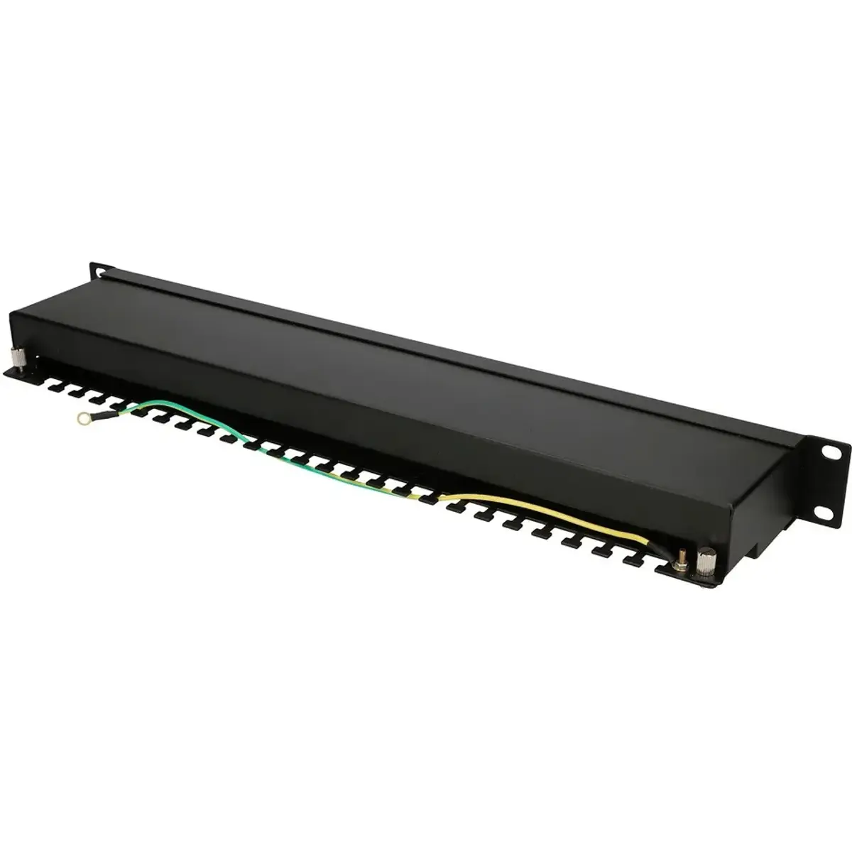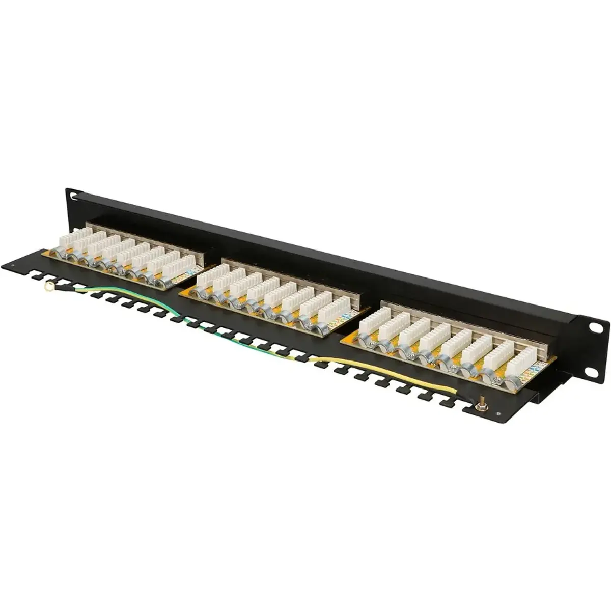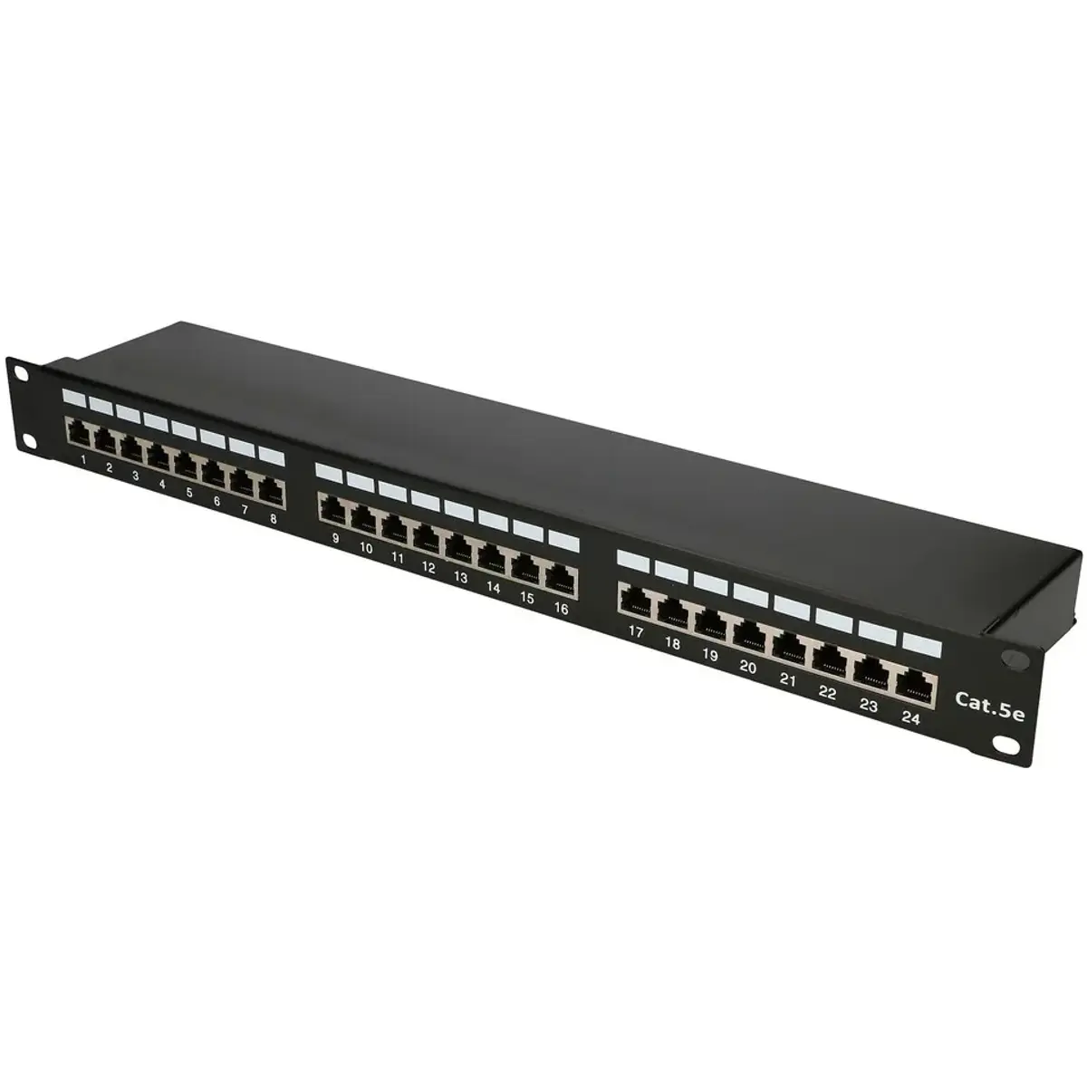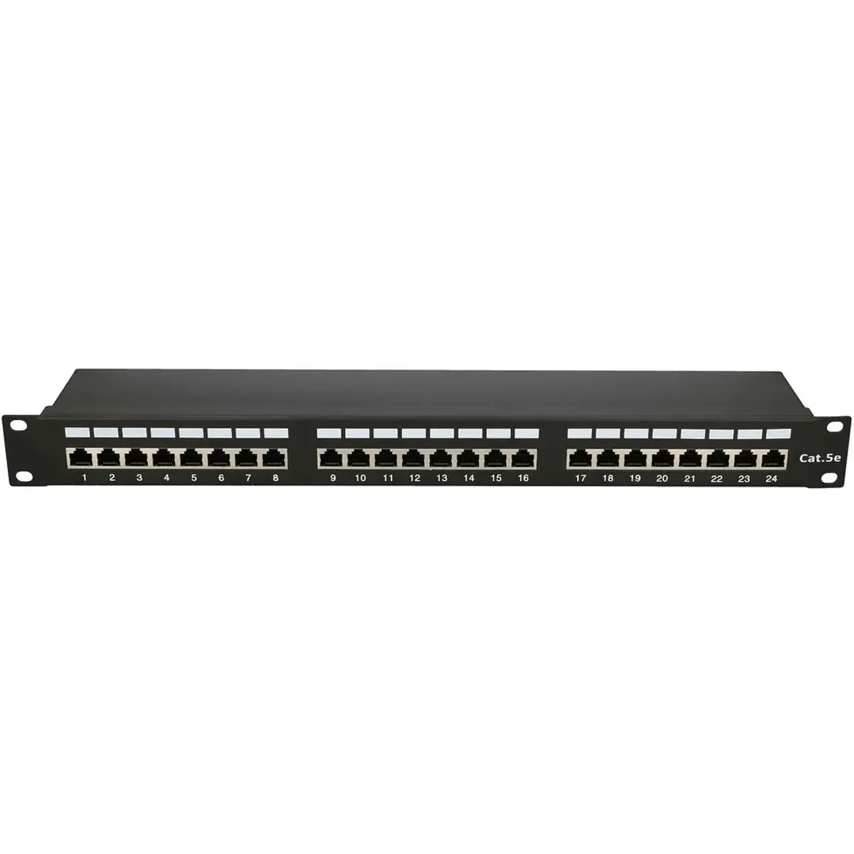 Painel de distribuição com 24 portas RJ45 Cat5e STP para rack de 19 polegadas, altura 1U, na cor preta. Ideal para redes estruturadas, oferece conectividade Ethernet estável com cabos blindados e redução de interferências. Compatível com chaves KRONE e com apoio para fixação de cabos, incluindo aterramento. Compatível com montagem em racks 19'' e não utiliza keystones, facilitando a organização da cablagem e a manutenção com desempenho confiável para redes empresariais.