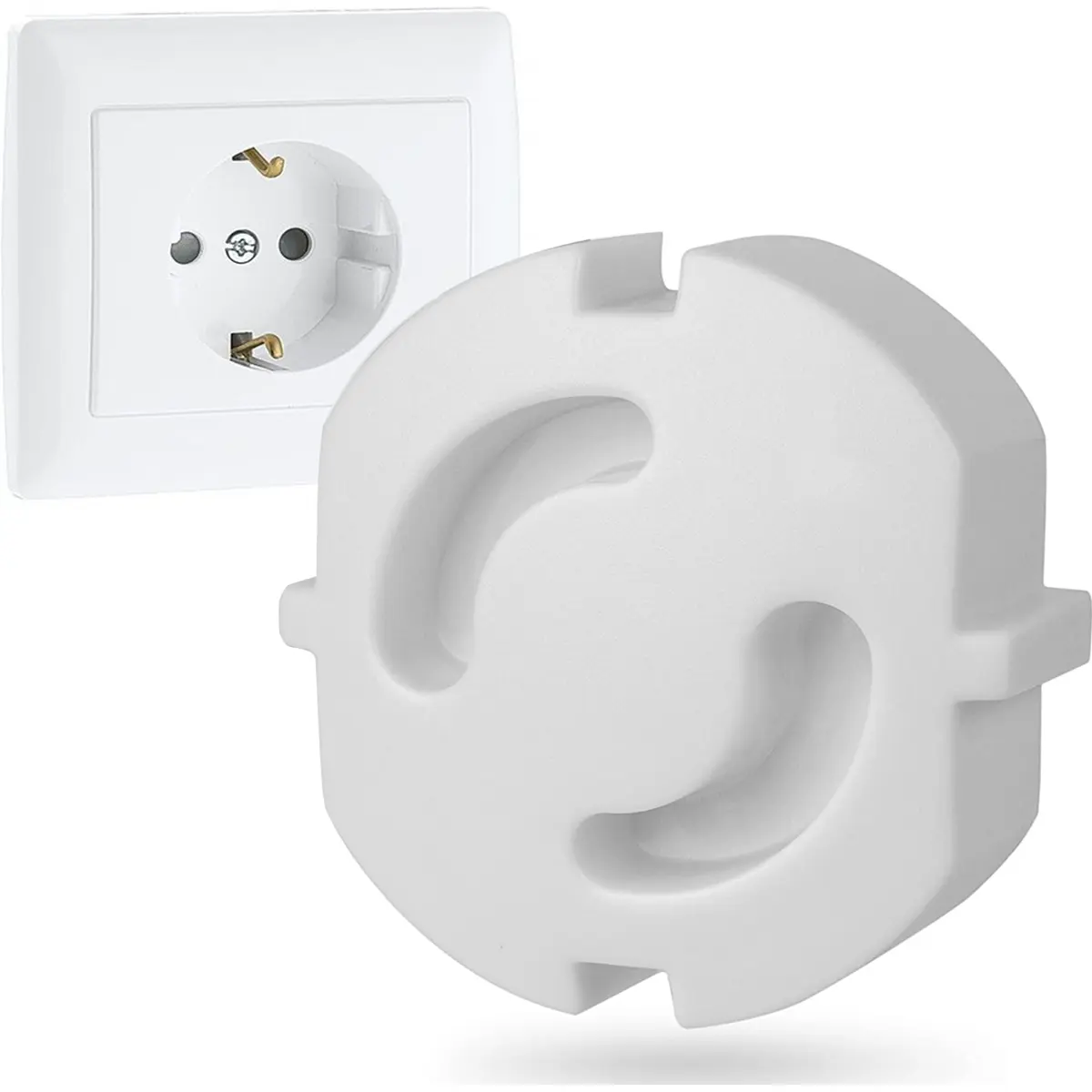 Protetor de crianças para tomadas Schuko que oferece proteção rápida e segura contra ferimentos. Impede a inserção de objetos ou dedos em tomadas que não estejam em uso.