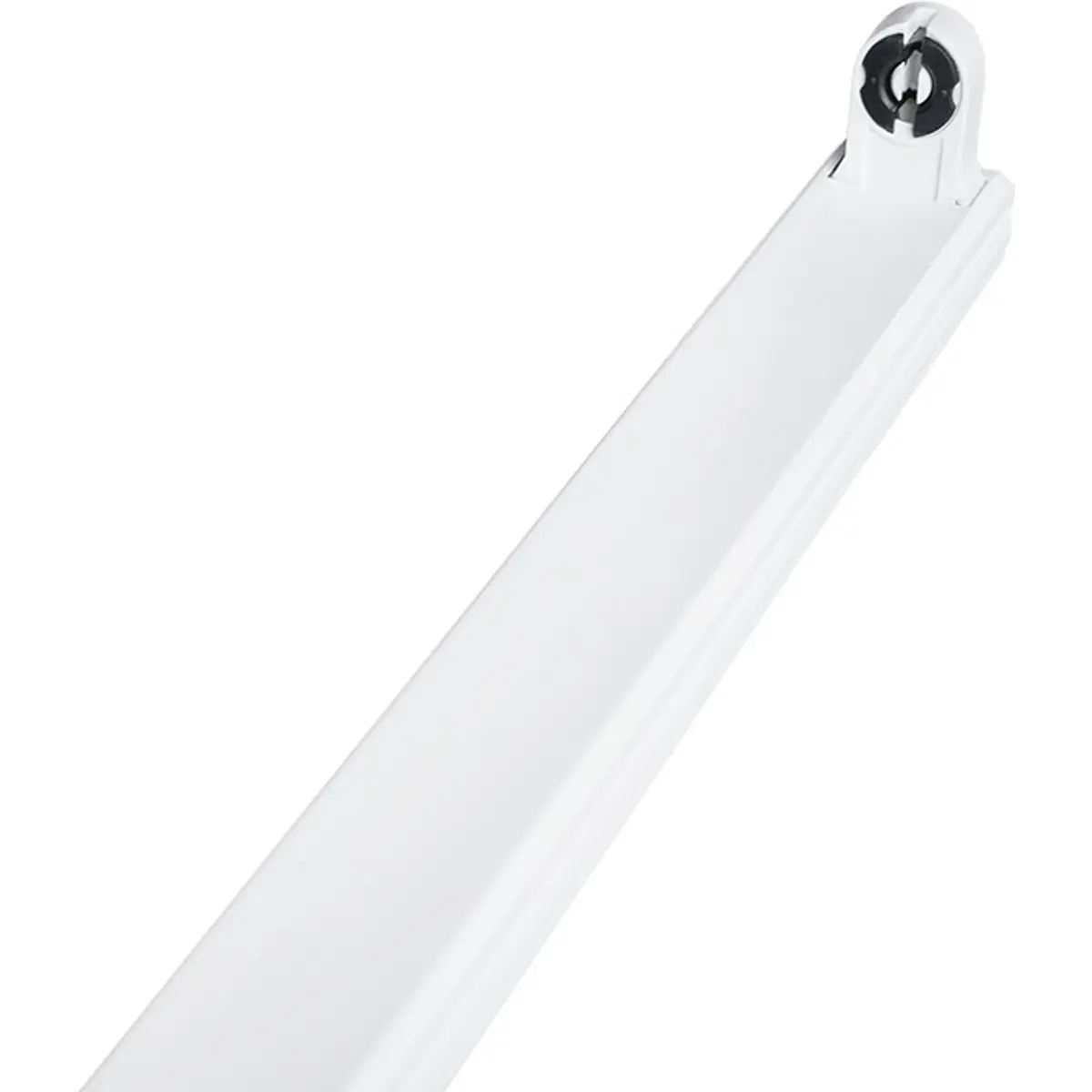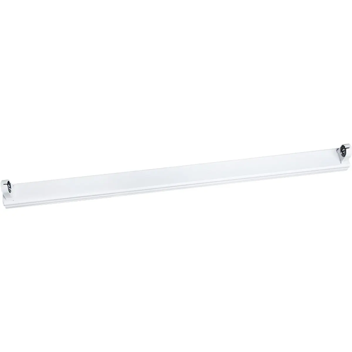 Armadura industrial simples para lâmpada LED T8 de 60 cm, instalada em superfície para uso interno (IP20). Suporta até 9W em ligação unilateral a 230V AC, com soquete G13 e corpo em metal, peso 0,15 kg. Ideal para iluminação funcional em espaços técnicos, escritórios e áreas de serviço.