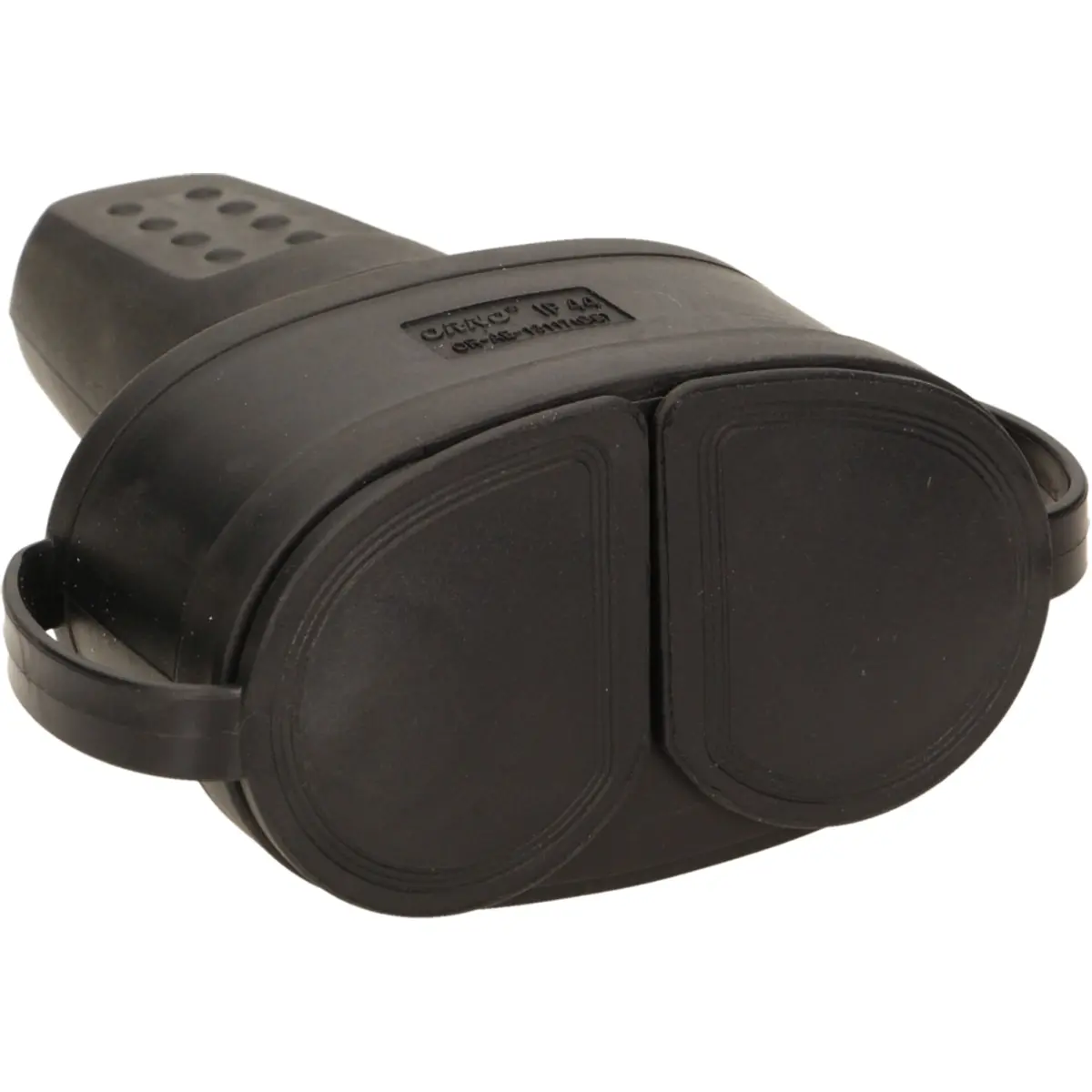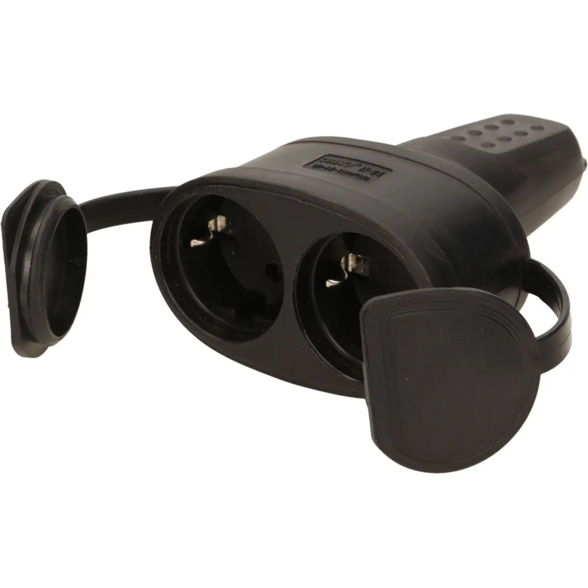 A ficha elétrica dupla fêmea com padrão schuko (tipo F) oferece dois soquetes com aterramento (2P+E) e proteção IP44. Construída em borracha preta, tem braçadeira de parafuso para montagem fácil, durável e segura, adequada a instalações que exigem proteção e fiabilidade.