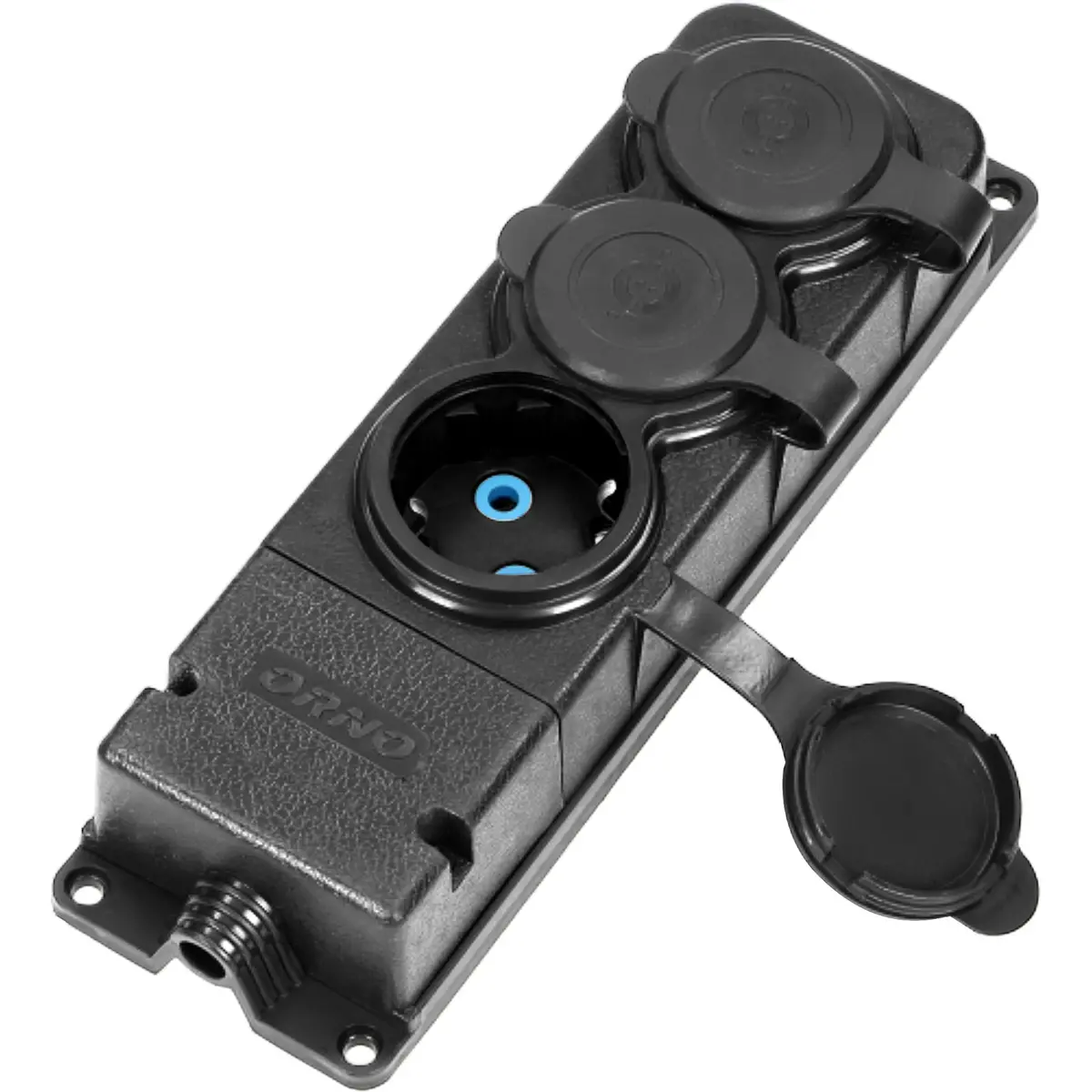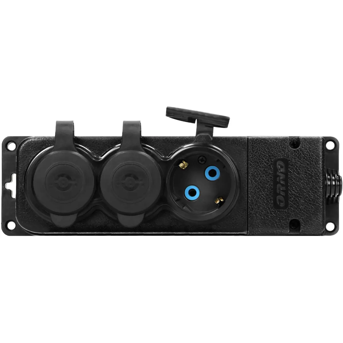 Tomada de extensão de serviço pesado com nível de proteção IP44. Possui três tomadas 2P+T com tampa vedada em borracha, protegendo-a contra respingos de água, pó ou sujidades. O dispositivo tem um orifício para pendurar, que permite pendurá-lo em um local seguro. Também tem quatro furos para parafusos que permitem a sua montagem em um local fixo seja no chão ou parede. As conexões dos cabos estão escondidas sob uma caixa removível de plástico. O dispositivo possui um prensa-cabo de borracha integrado. Esta tomada de extensão tem um perfil muito baixo de 5 cm.