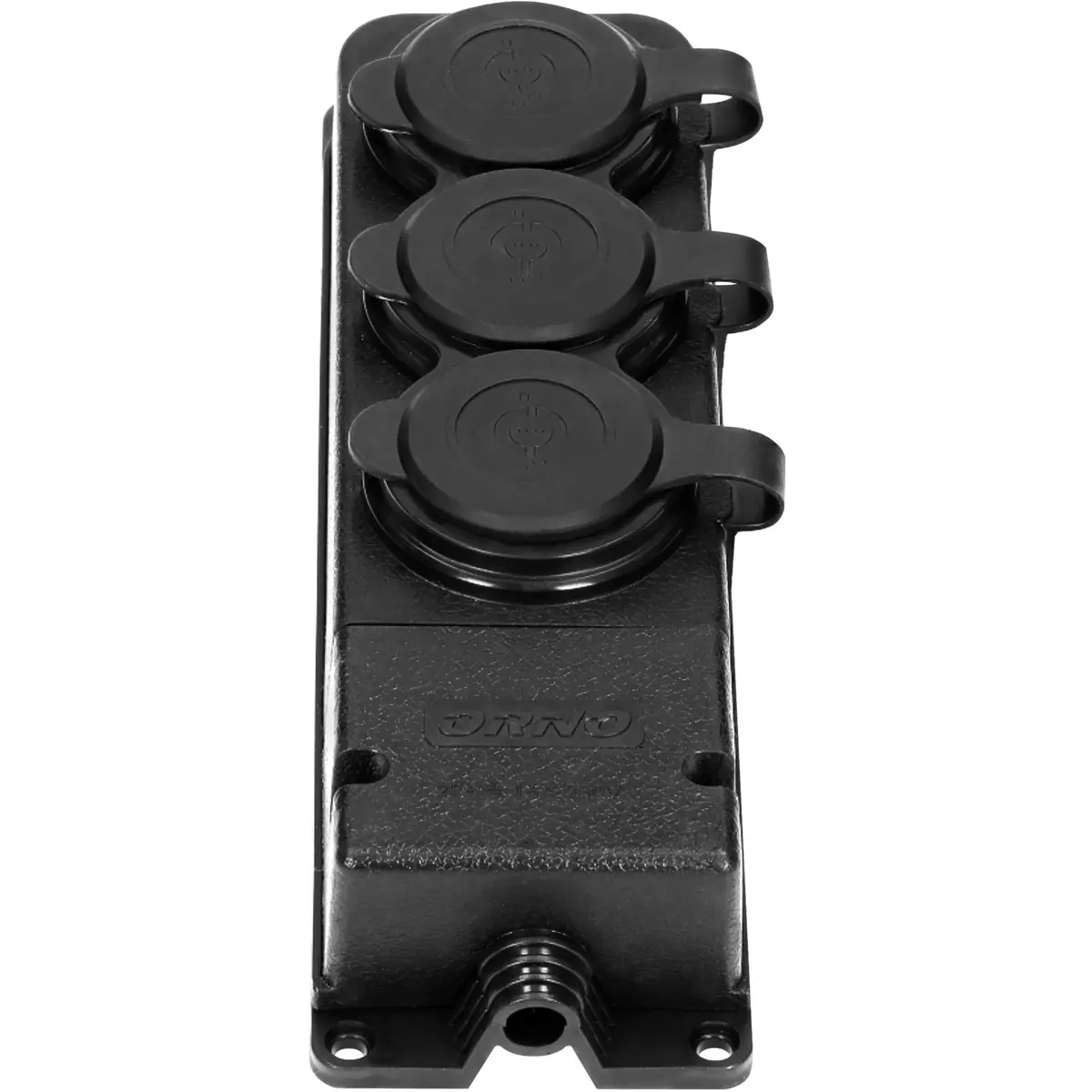 Bloco de tomada de serviço para exterior com proteção IP44, três tomadas 2P+E no padrão schuko tipo F, tampa vedada em borracha e corpo resistente a água, pó e vandalismo. Possui prensa-cabo integrado, prende-se por meio de furos para montagem no chão ou na parede, caixa de plástico removível e ficha de 16A. Convida a utilização em áreas exteriores, jardins ou locais industriais; dimensões compactas (50 mm de profundidade, 73 mm de largura, 228 mm de altura) para instalação discreta; cor preta.