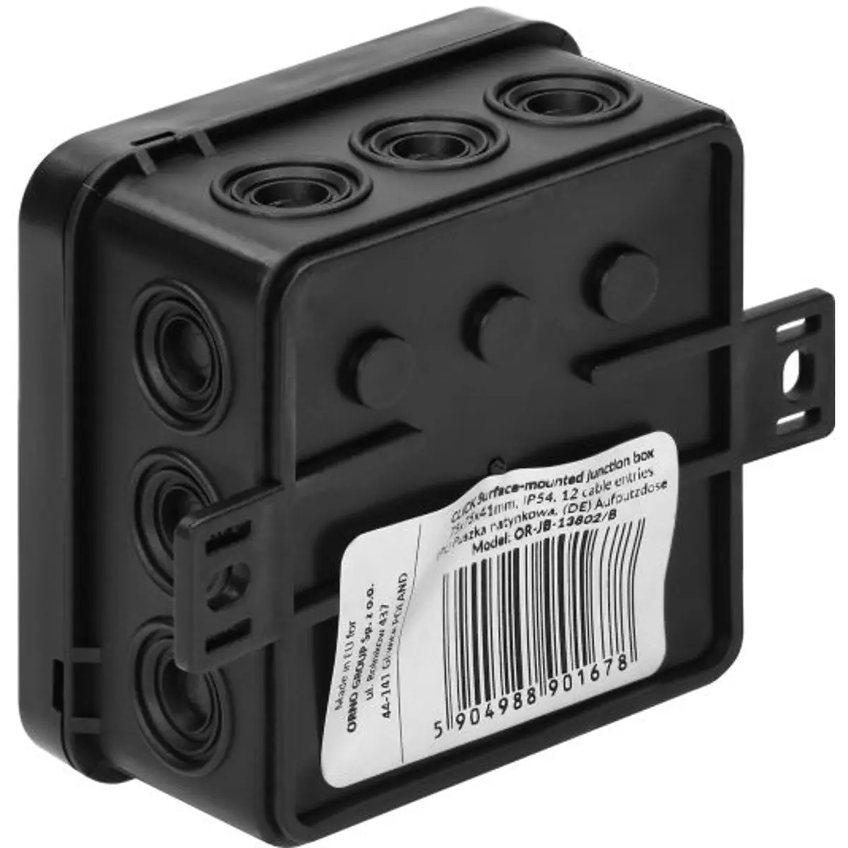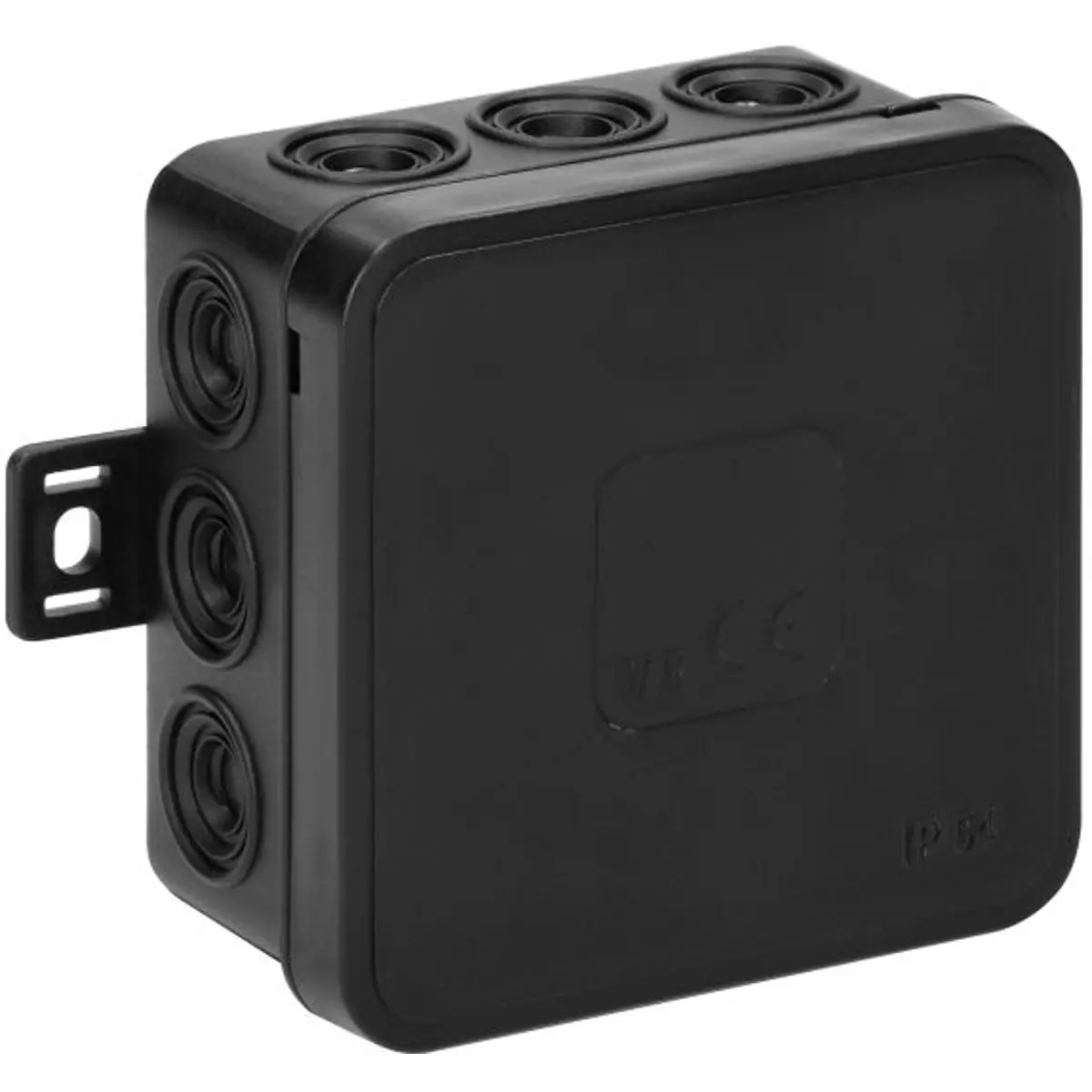 Caixa de derivação estanque com classificação IP54 para proteção de ligações elétricas em ambientes com poeira e humidade. Oferece 12 entradas de cabo, entrada eliminatória e dimensões de 75x75x41 mm, com fecho de pressão e acabamento em preto. Ideal para instalação em ambientes exteriores ou sujeitos a poeira, proporcionando resistência, fiabilidade e organização das ligações elétricas, mantendo o acesso seguro graças ao fecho de pressão.