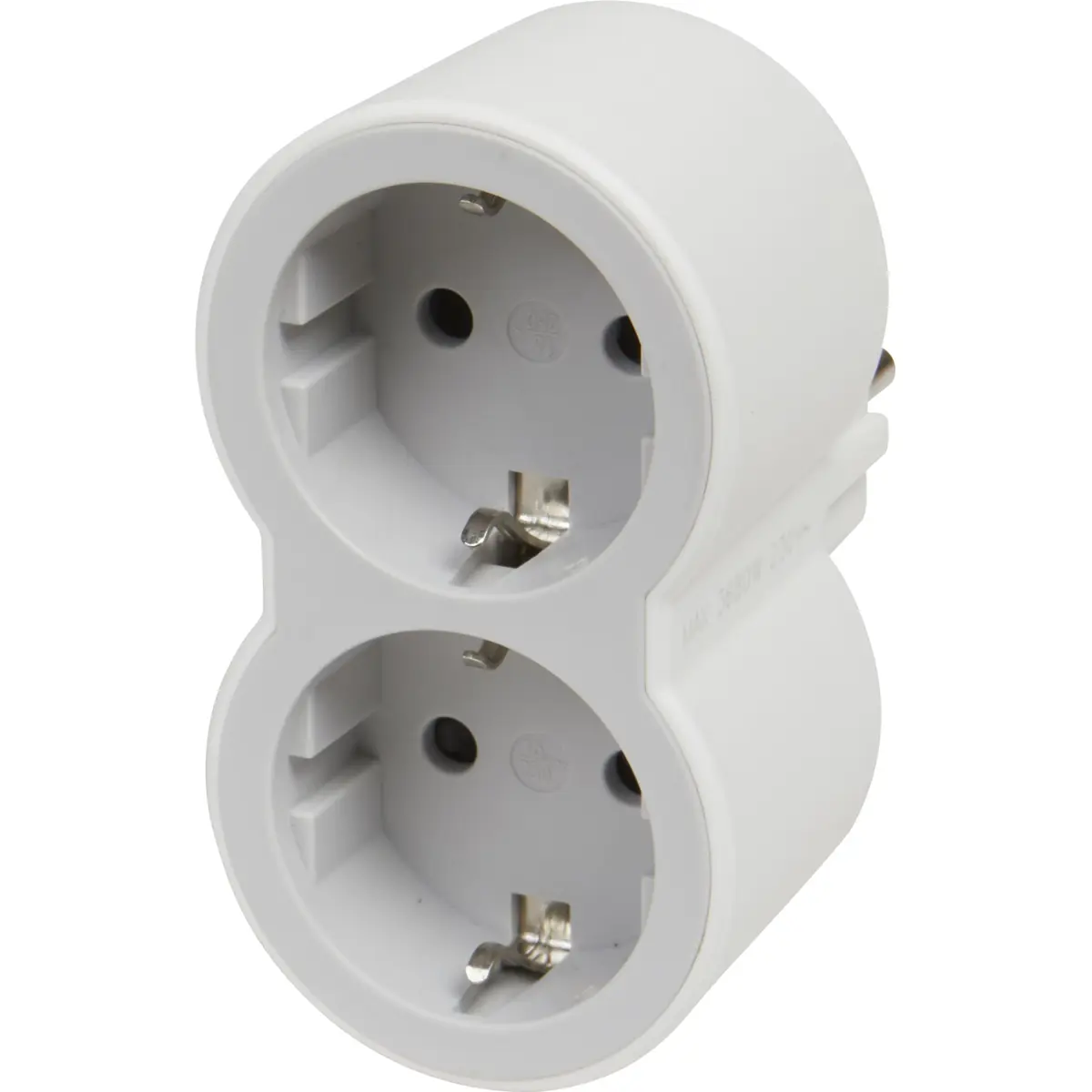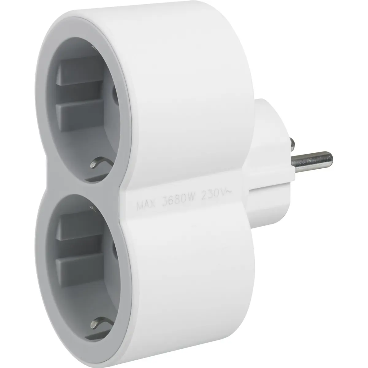 Ficha múltipla schuko dupla para uso em interiores, com 230 V e 16 A, suportando até 3.680 W. Possui duas tomadas 2P+T de saída frontal, oferecendo uma solução prática para ligar diversos dispositivos elétricos em espaços interiores. Ideal para ambientes domésticos e de escritório, mantendo a organização com uma única unidade de alimentação.