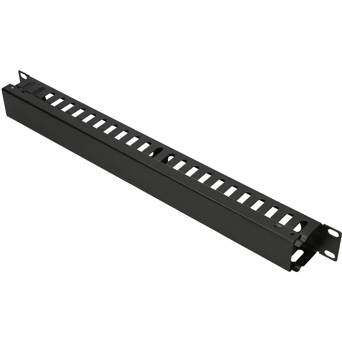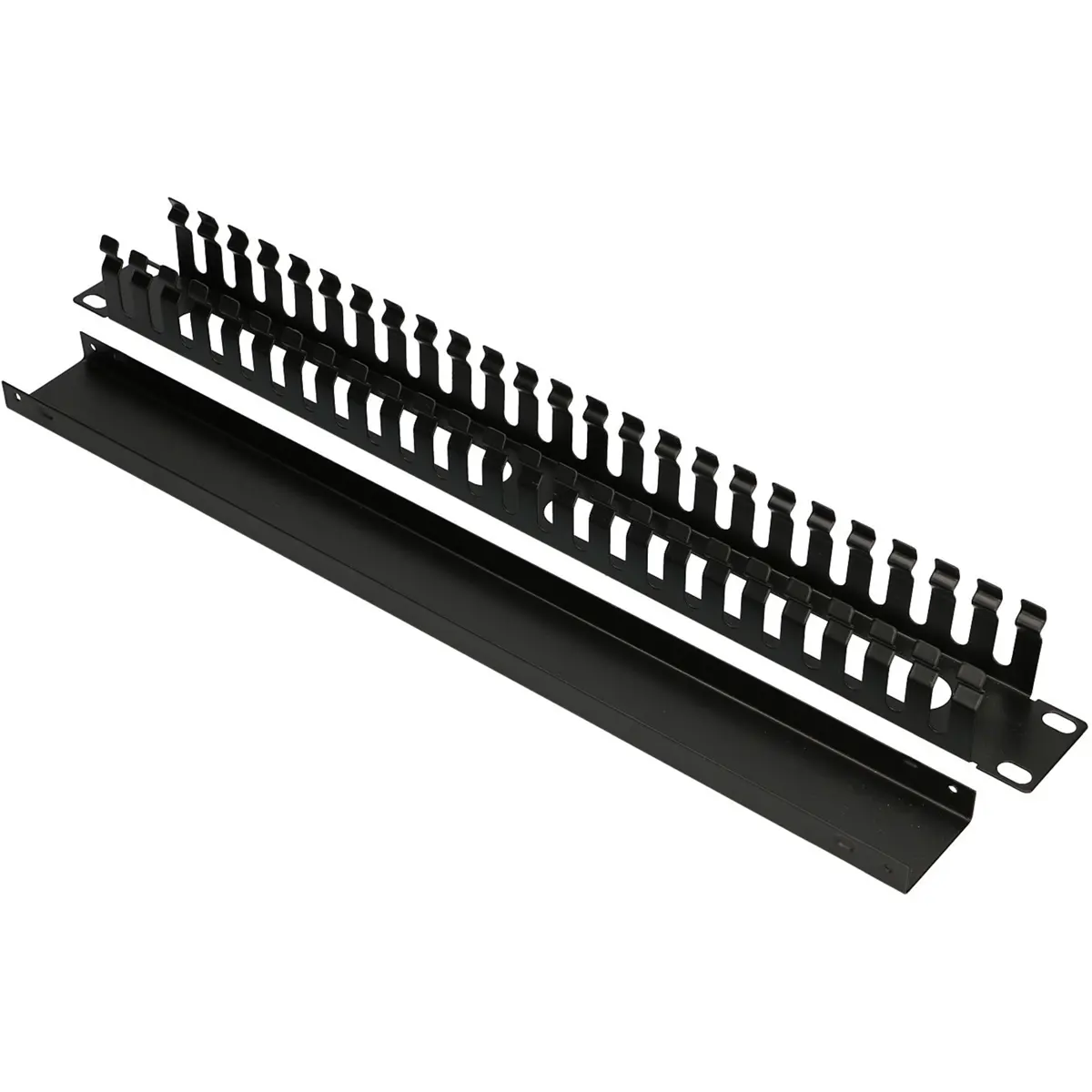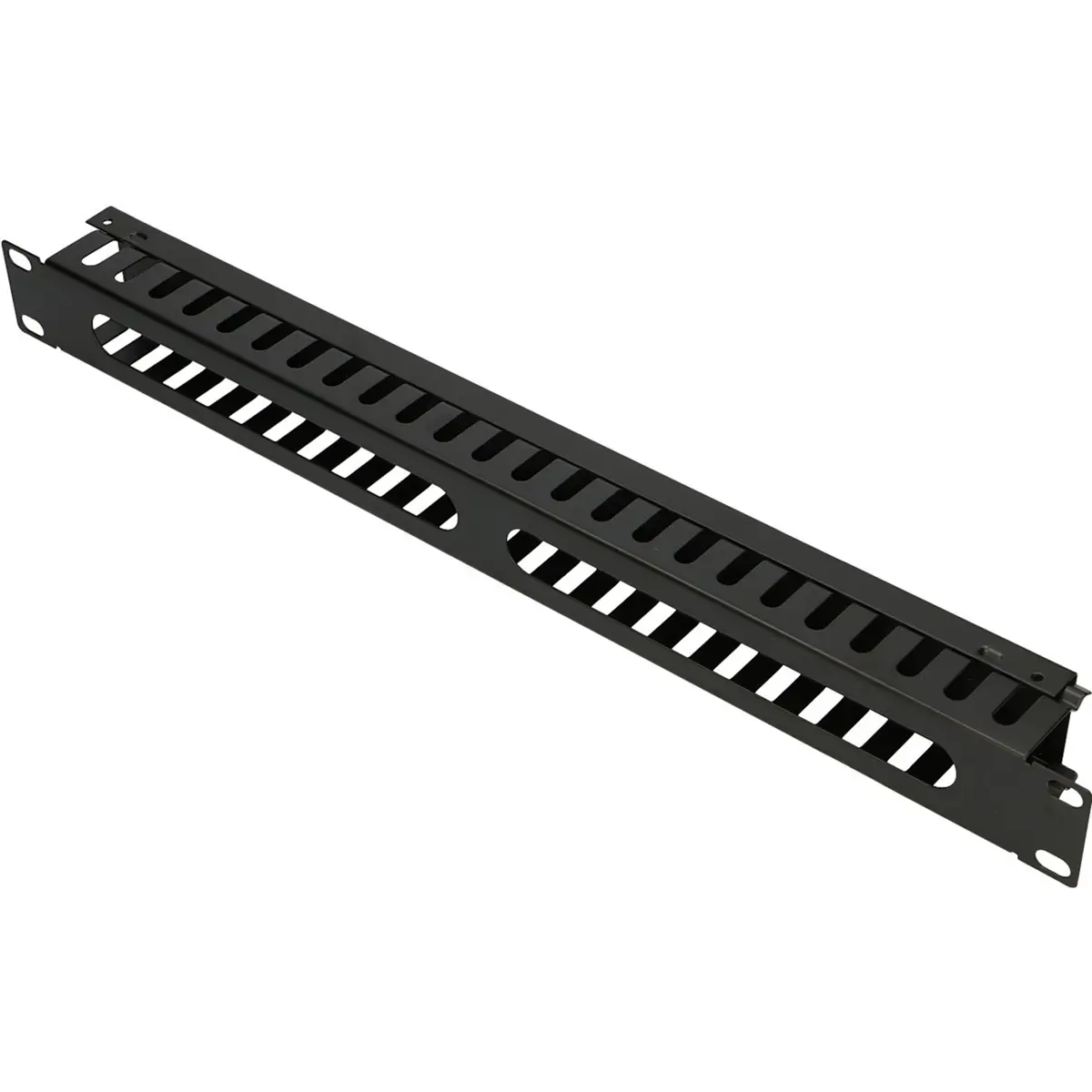Organizador de cabos para armário rack 19'' 1U, em metal preto, que facilita a organização e fixação da cablagem. Compatível com painéis 19'' e oferece suporte para até 24 portas-cabos, mantendo a cablagem protegida durante a abertura e o fecho do armário. Ideal para escritórios e instalações de TI, assegurando ordem, acesso rápido às ligações e menor risco de danos elétricos. Construção resistente em metal, concebida para uso contínuo em ambientes de rack.