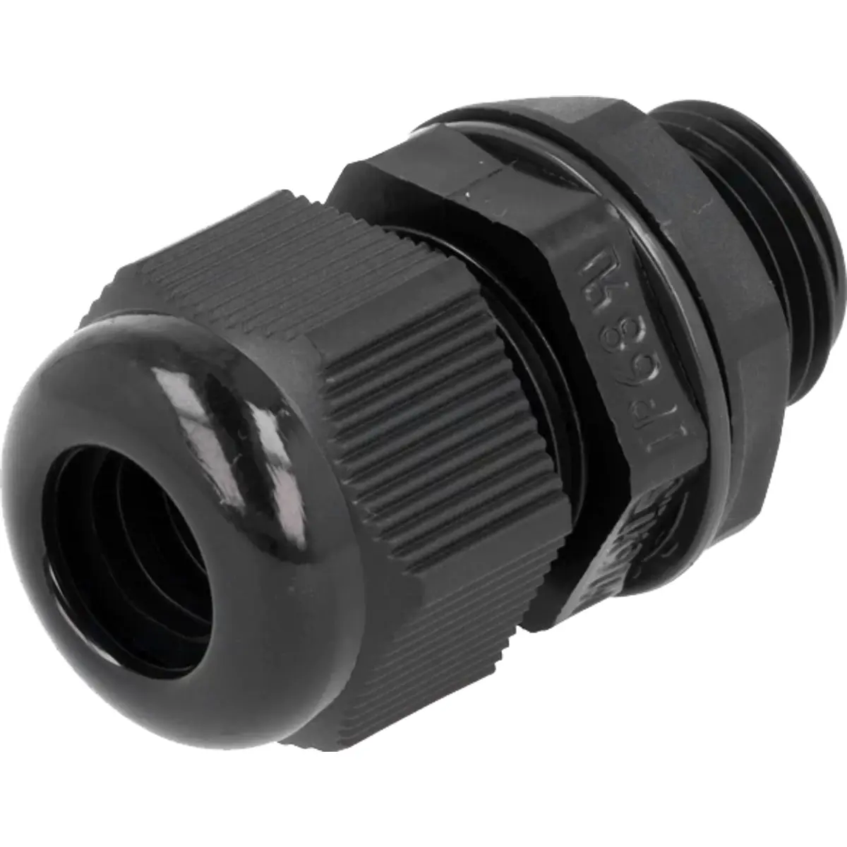 Conector roscado de uso industrial para cabos Ø5-10 mm, com rosca métrica M16, passo 1,5 mm e corpo em poliamida preto. Classificação IP68 e inflamabilidade UL94V-2 asseguram resistência a água, poeira e fogo. Acompanha junta e porca; anel isolante com rosca prolongada para vedação segura. Compatível com acessórios de rosca métrica, ideal para ligações protegidas em ambientes exteriores e maquinaria.