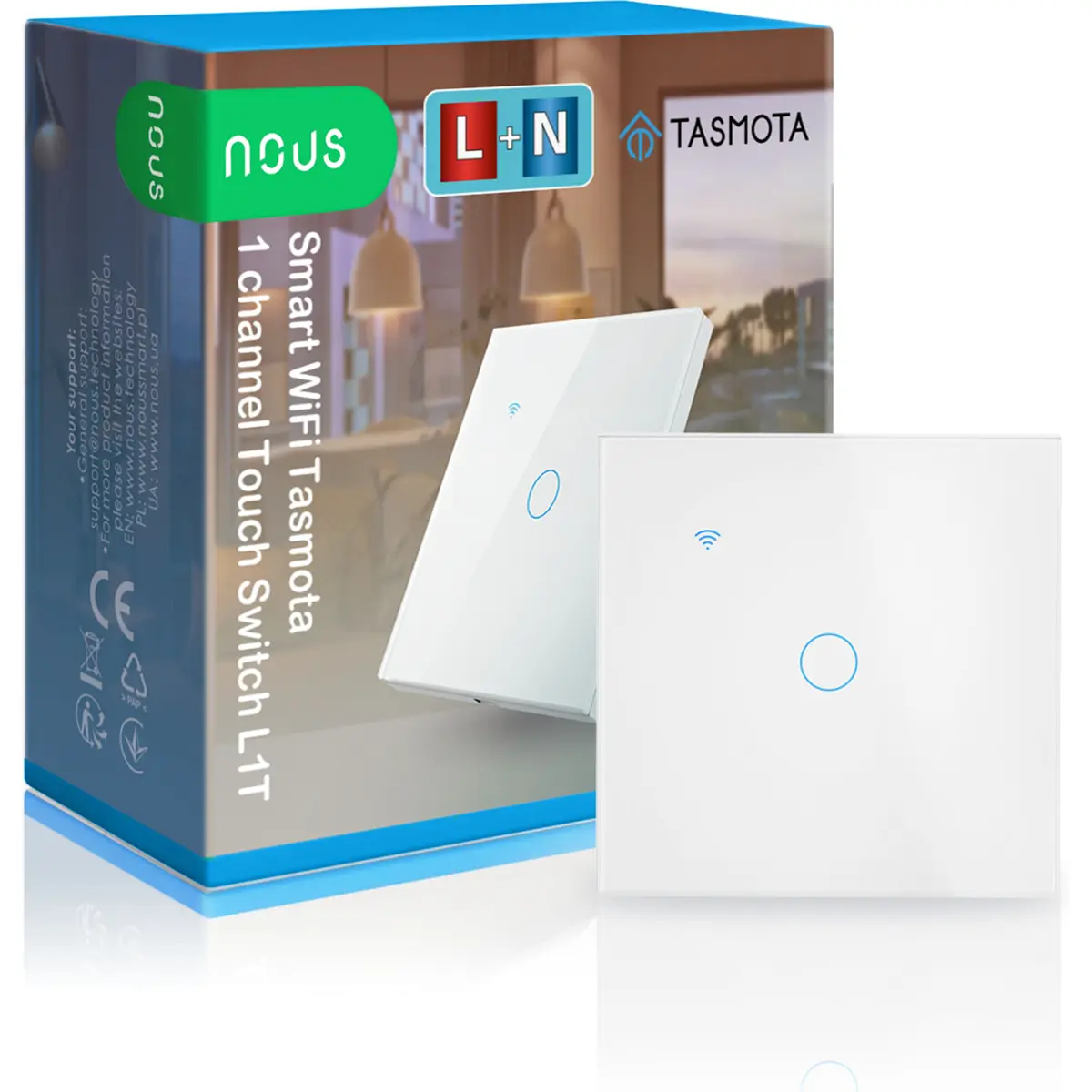 O Nous L1T é um interrutor de 1 canal (1 gang) que pode controlar uma fonte de luz, como uma lâmpada ou um candeeiro. Pode ser montado na parede como um interrutor normal e tem uma superfície sensível ao toque que lhe permite ligar e desligar a luz com um simples toque. Também é possível controlar a luz a partir do telemóvel, utilizando a interface web do Tasmota ou uma aplicação como o TasmoAdmin.