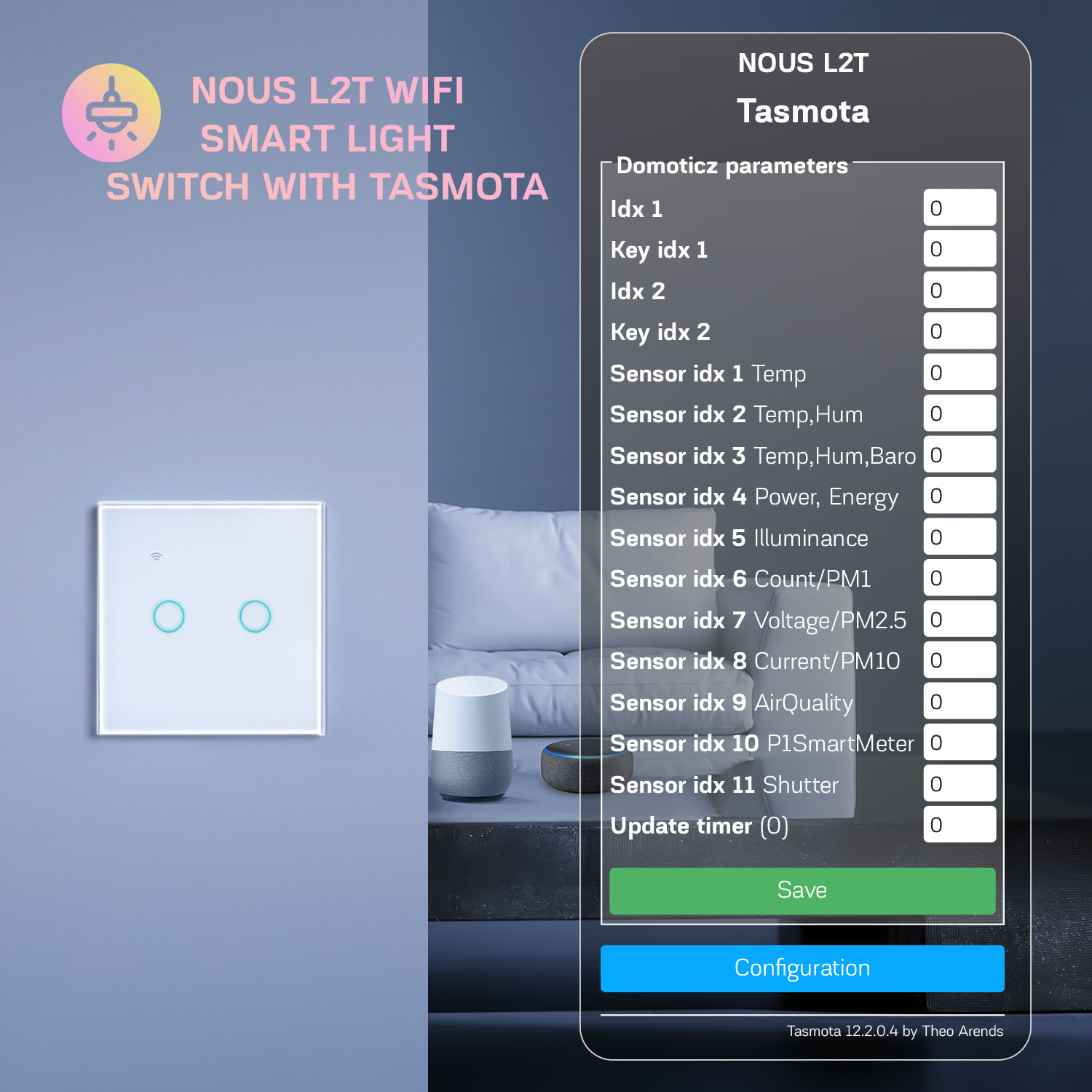 O Nous L2T é um interrutor de 2 canais (2 gang) capaz de controlar duas fontes de luz, como lâmpadas ou candeeiros. Pode ser montado na parede como um interrutor normal e tem uma superfície sensível ao toque que lhe permite ligar e desligar a luz com um simples toque. Também é possível controlar as luzes a partir do telemóvel, utilizando a interface web do Tasmota ou uma aplicação como o TasmoAdmin.