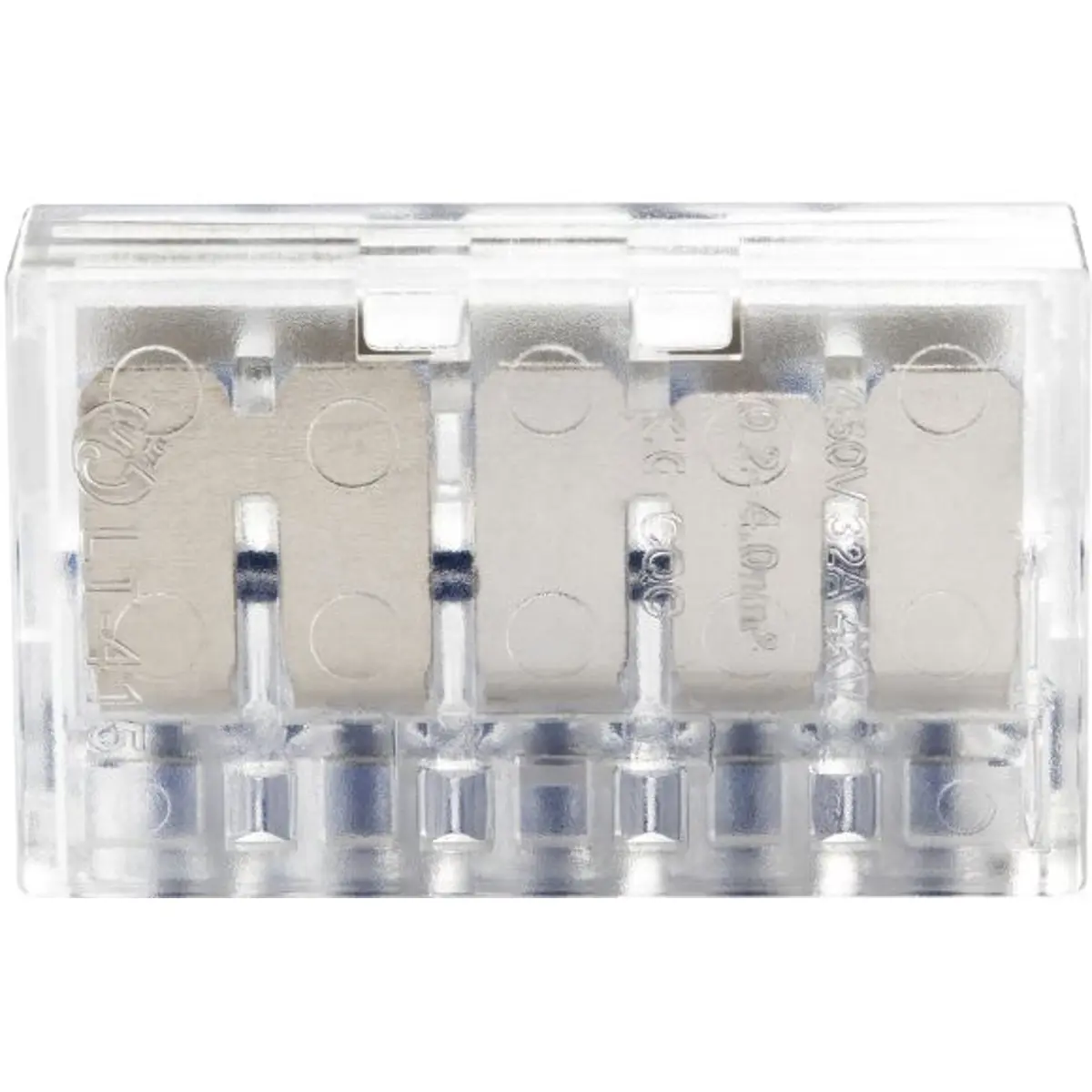 Conector rápido de instalação para ligações elétricas, destinado a fios unifilares e multifilares até 4 mm². Possui aperto de molas, tensão nominal de 450 V e corrente nominal de 32 A, com montagem mecânica com cabo e versão com alavanca, oferecendo cinco vias num único conector. Compatível com 0.2 a 4 mm² (24-12 AWG) segundo norma IEC, garantindo fiabilidade e rapidez na montagem de ligações elétricas em quadros e painéis.