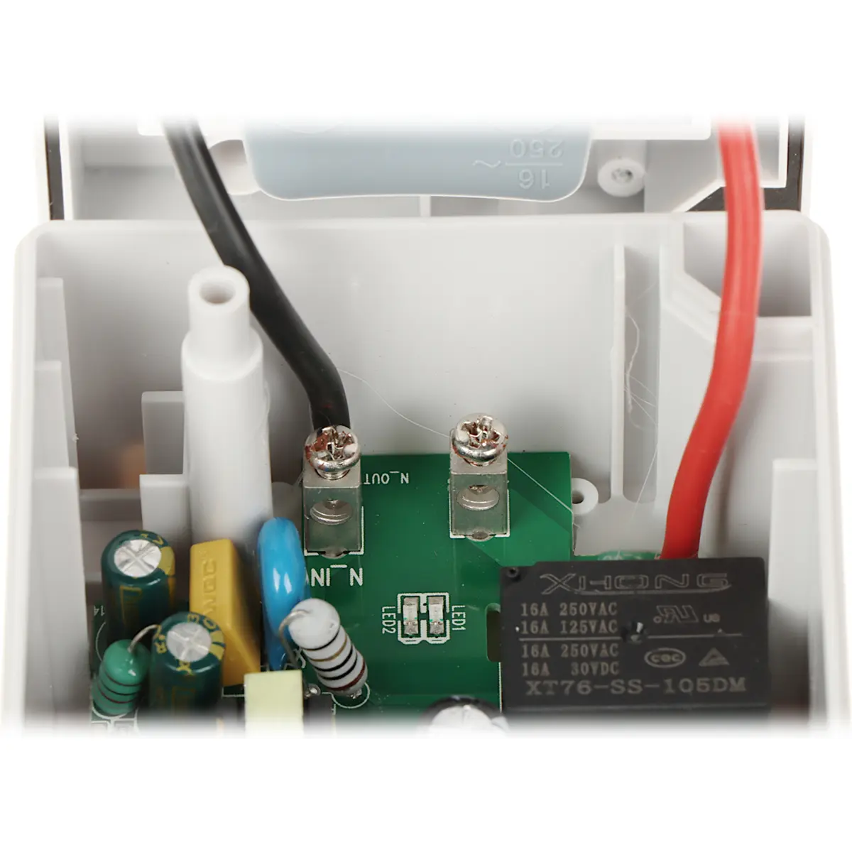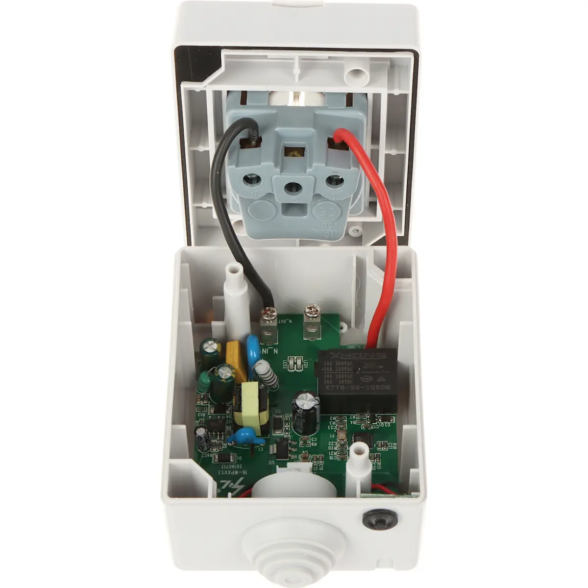 Tomada inteligente Schuko para uso externo, controlável via app Tuya Smart (Android e iOS) com internet. Permite programar horários de ligação e desligamento, modo ausente para simular presença, e controlo por voz com Alexa ou Google Assistant. Com Wi-Fi 2.4 GHz (IEEE 802.11b/g/n) e módulo Bluetooth integrado para manter o controlo quando a rede falha. Especificações: 100-250V, 50/60Hz, 4000W, 16A; IP55, 96x70x65 mm, peso 0.178 kg.