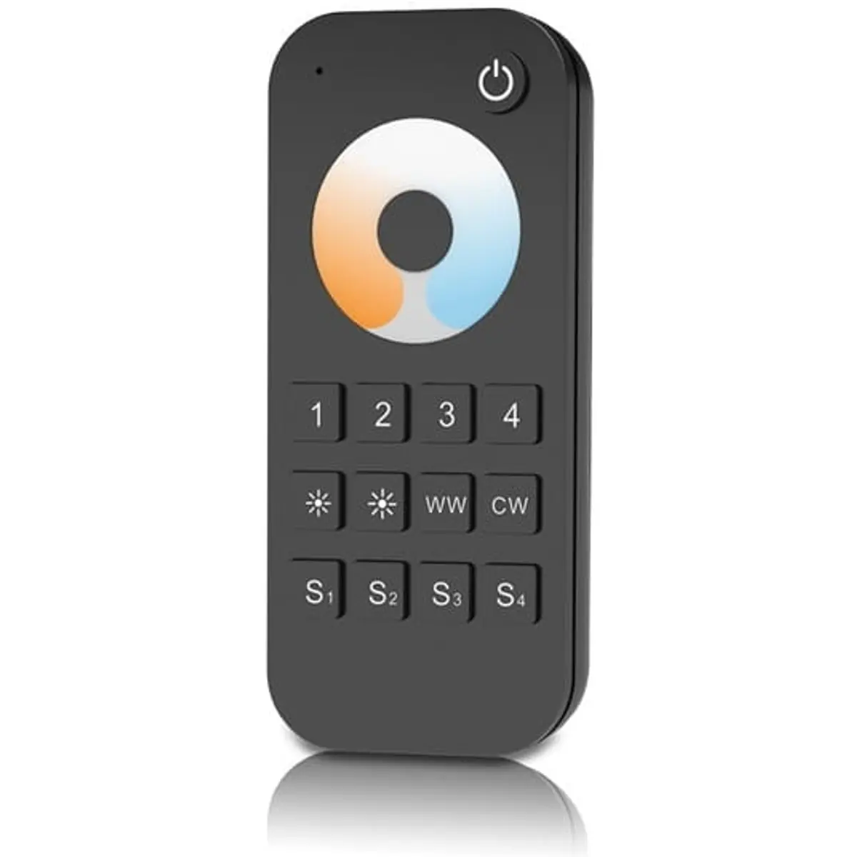 Este comando remoto tátil de alta qualidade destina-se a ser utilizado em conjunto com controladores CCT, proporcionando uma gestão eficaz de sistemas de iluminação ajustável com temperatura de cor variável (CCT). O seletor sensível do comando remoto assegura mudanças de cor intuitivas e simples, abrangendo desde tons quentes até frios. Além disso, o controlo remoto sem fios permite ajustes contínuos na intensidade luminosa. O invólucro estético do comando remoto apresenta um elegante acabamento em preto. A alimentação é fornecida por 3V DC (2 x pilhas AAA), e um suporte de montagem com íman está incluído para maior praticidade.