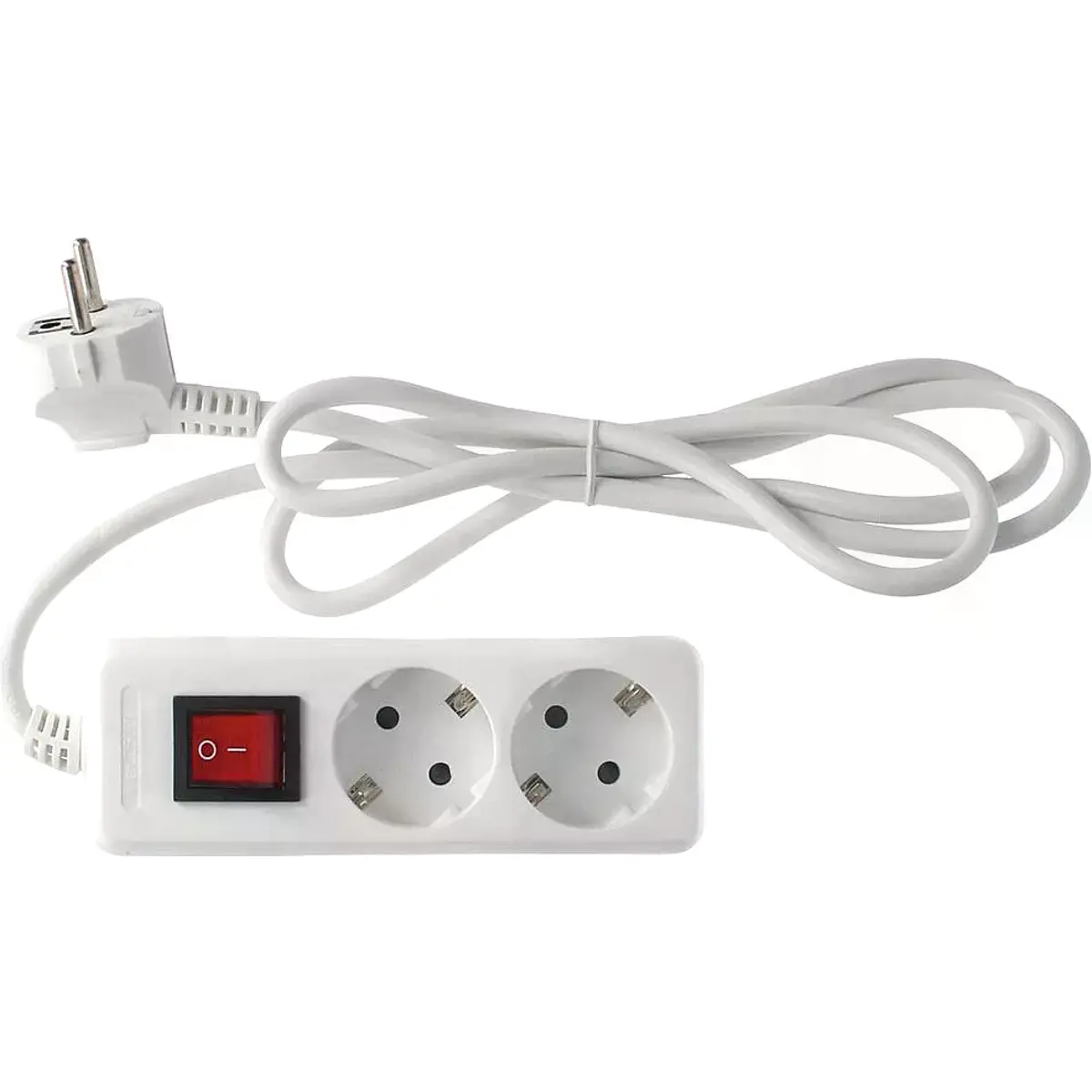 Base de 2 tomadas com interruptor, cabo de 3 m, tipo de cabo H05VV-F, seção 3x1,5 mm², potência máxima 3680 W, 250 V e 50 Hz, para tomada de 2P+TT lateral. Inclui proteção para crianças, cor branca e interruptor de fácil acesso, ideal para uso doméstico ou de escritório, assegurando alimentação estável para equipamentos até 16 A.
