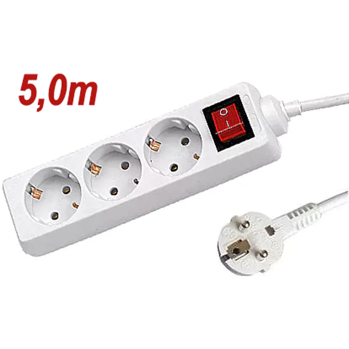 Bloco de tomadas com base múltipla de 3x Schuko e interruptor integrado, ideal para uso interior. Possui cabo elétrico de 5,0 m tipo H05VV-F com secção 3x1,5 mm², permitindo ligação de aparelhos até 3500 W. A cor é branca, adequado para ambientes domésticos ou de escritório. Proporciona alimentação segura com ligações estáveis, organizando tomadas num único ponto com alcance conveniente.