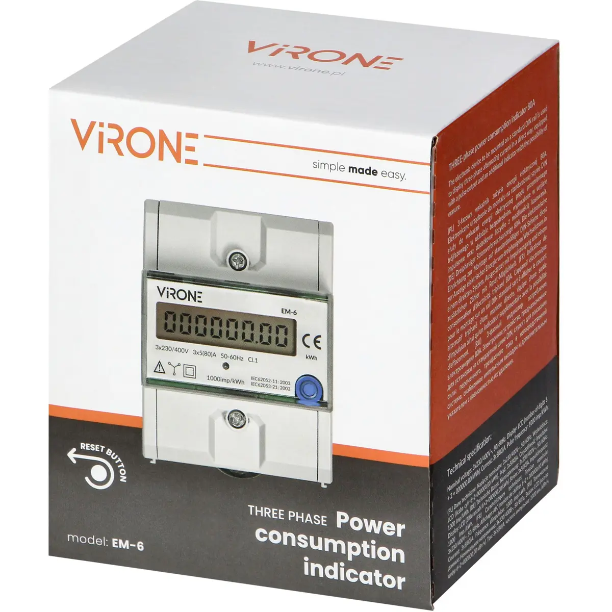 Virone EM-6 - Medidor digital de consumo de energia trifásico 3x5A(80A) c/ saída Pulso + Reset - para calha DIN
