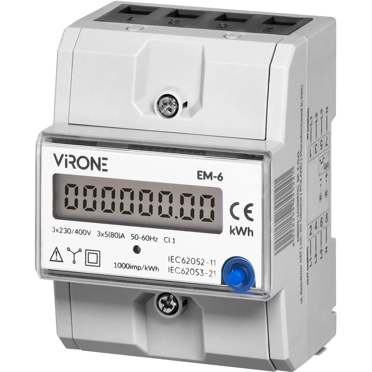 O Virone EM-6 é um medidor digital de energia trifásico com corrente nominal de 5 A e capacidade até 80 A, concebido para monitorizar o consumo em instalações trifásicas. Possui saída de pulso S0 para integração com equipamentos externos e controlo de cargas, botão de reset e montagem em calha DIN TH-35 (4,5 módulos). Opera com tensões NL de 230 V e LL de 400 V, frequência 50/60 Hz, classe de precisão B e proteção IP51. Ideal para indústria e gestão de energia para reduzir custos através da monitorização contínua.