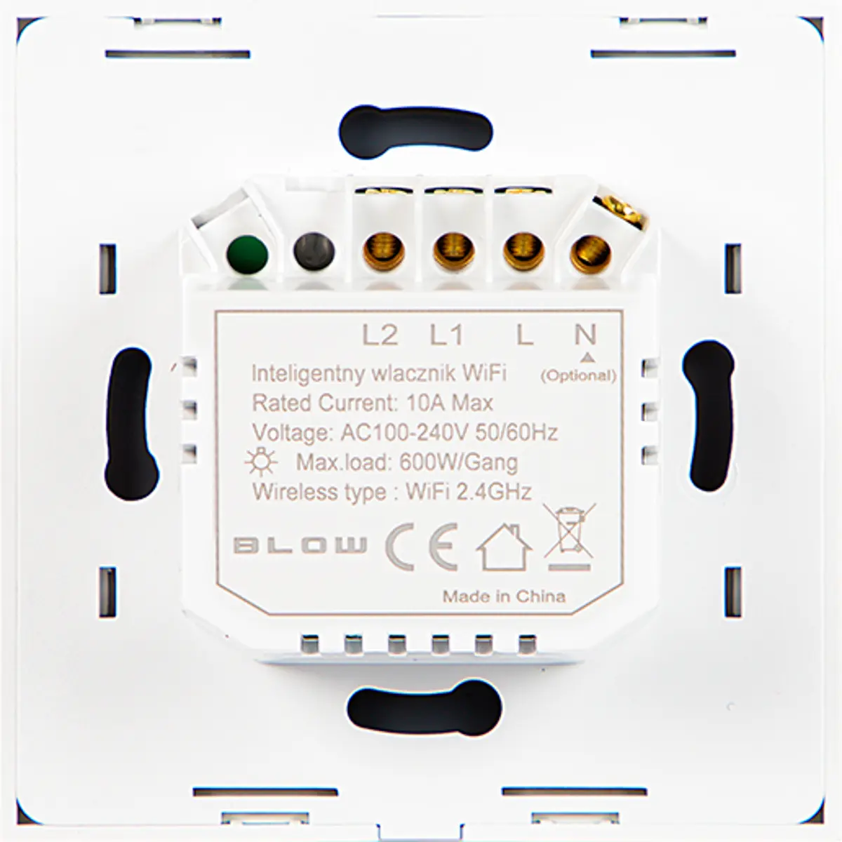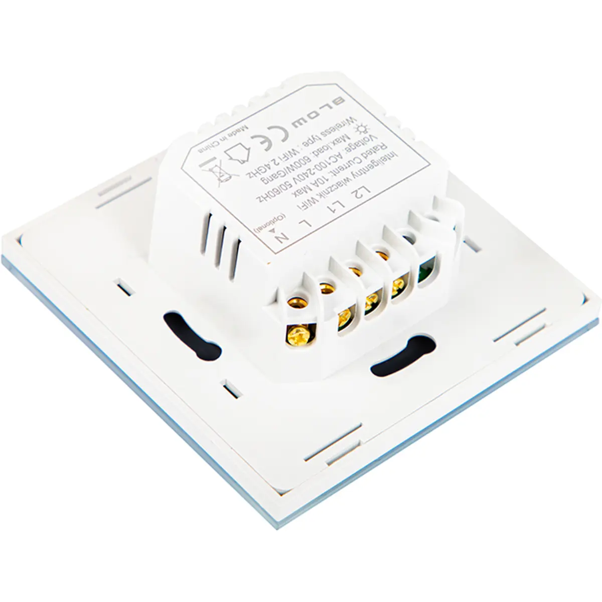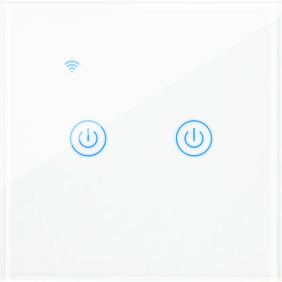Interruptor duplo inteligente em vidro com conectividade Wi-Fi e Bluetooth para controlo remoto via aplicações gratuitas, como Tuya ou SmartLife. Permite criar cenários, automação de iluminação e gestão de dois circuitos. Pode ser instalado sem neutro (com condensador incluído). Suporta 100-240Vac (N+L) ou 220-240Vac (L), até 600W por canal (N+L) ou 400W por canal (L, sem neutro) e 10A por canal. Compatível com Wi-Fi 802.11 b/g/n na banda de 2,4 GHz, para iOS e Android.