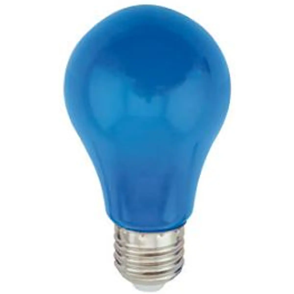 Lâmpada LED azul com base E27, potência de 1W, a operar entre 220-240V e 50 Hz. Oferece ângulo de abertura de 300°, iluminação imediata em menos de 0,5 segundos e CRI ≥80. Com IP20 e vida útil de 25.000 horas, tem dimensões Ø60 x 105 mm e temperatura de operação de -15°C a +40°C. Ideal para iluminação interior decorativa que requer cor azul, eficiência energética e boa reprodução de cor em ambientes residenciais.