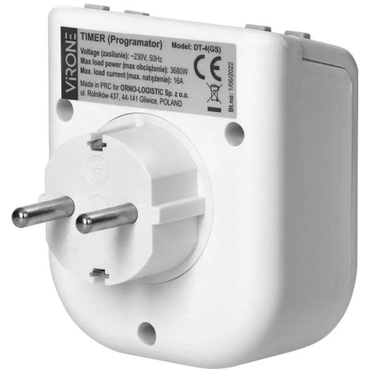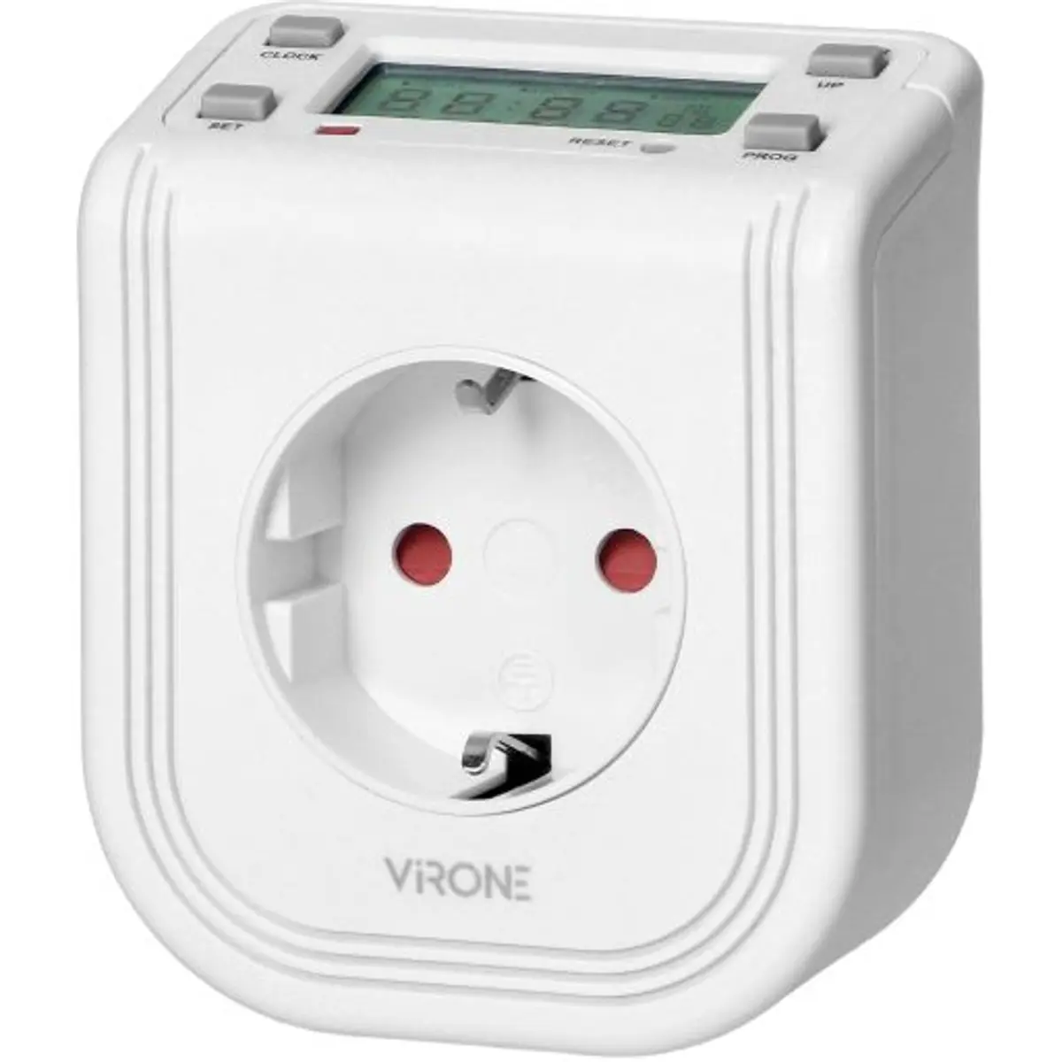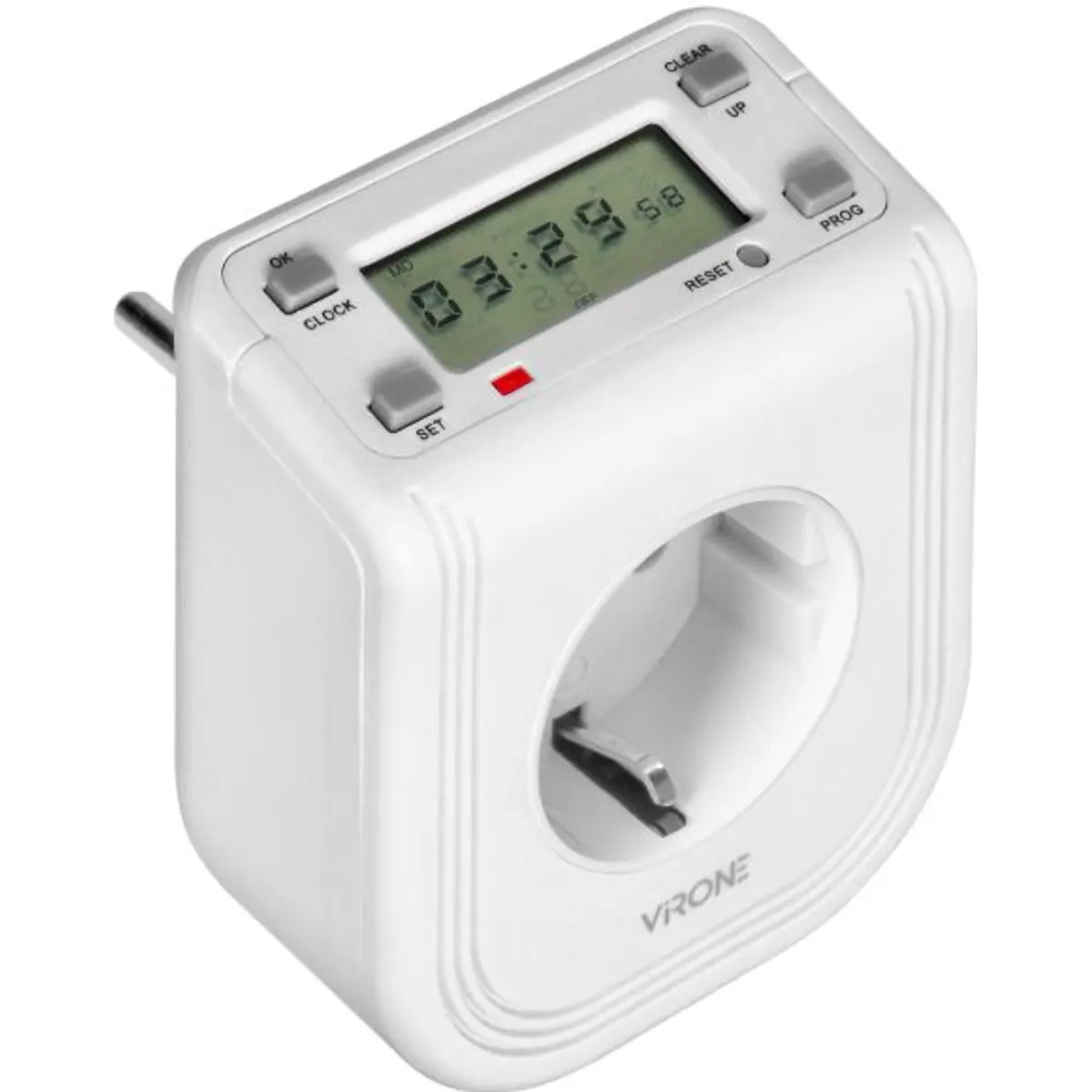 Tomada horária digital com display LCD para ajuste do horário de ligar e desligar dispositivos elétricos como: iluminação, esquentadores, publicidade, etc. Possui 16 programas de horário, quatro botões grandes e um grande display LCD embutido na parte superior.