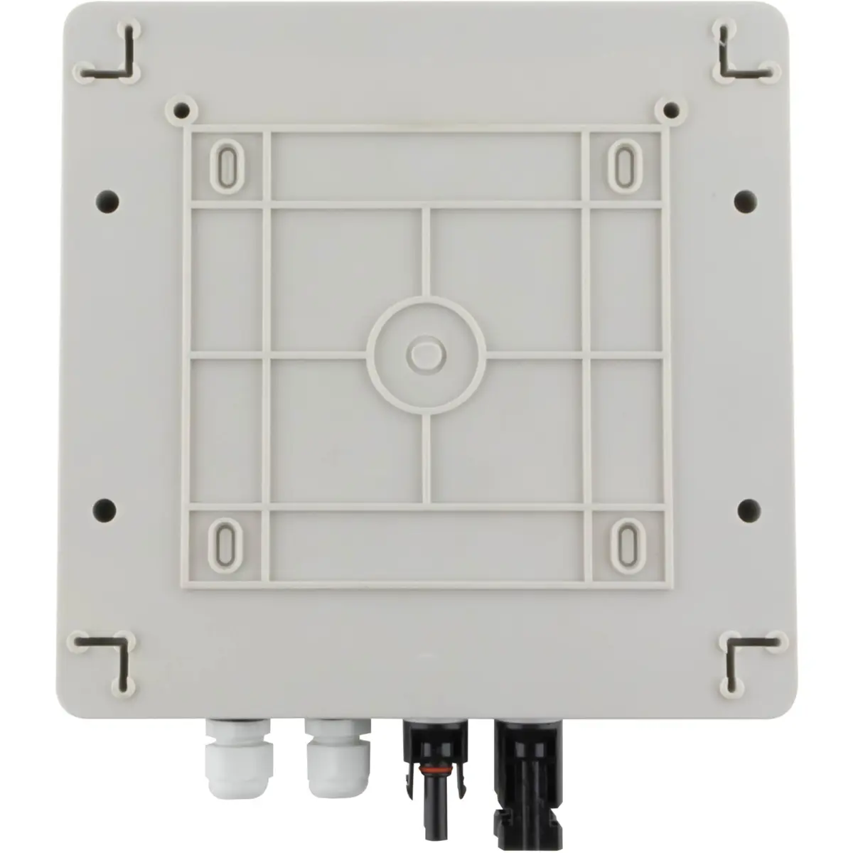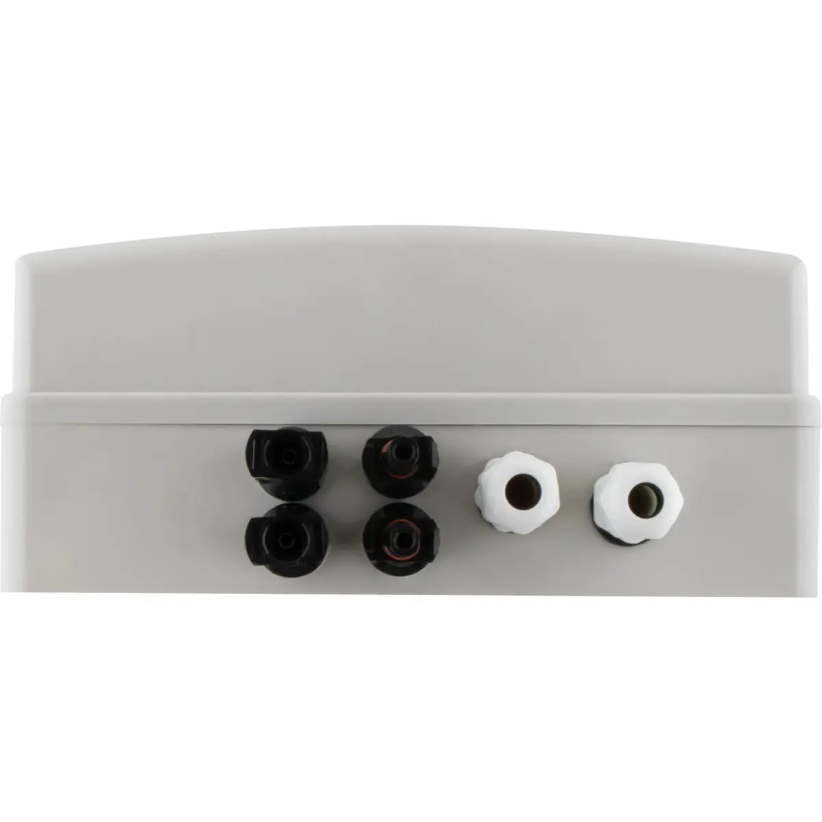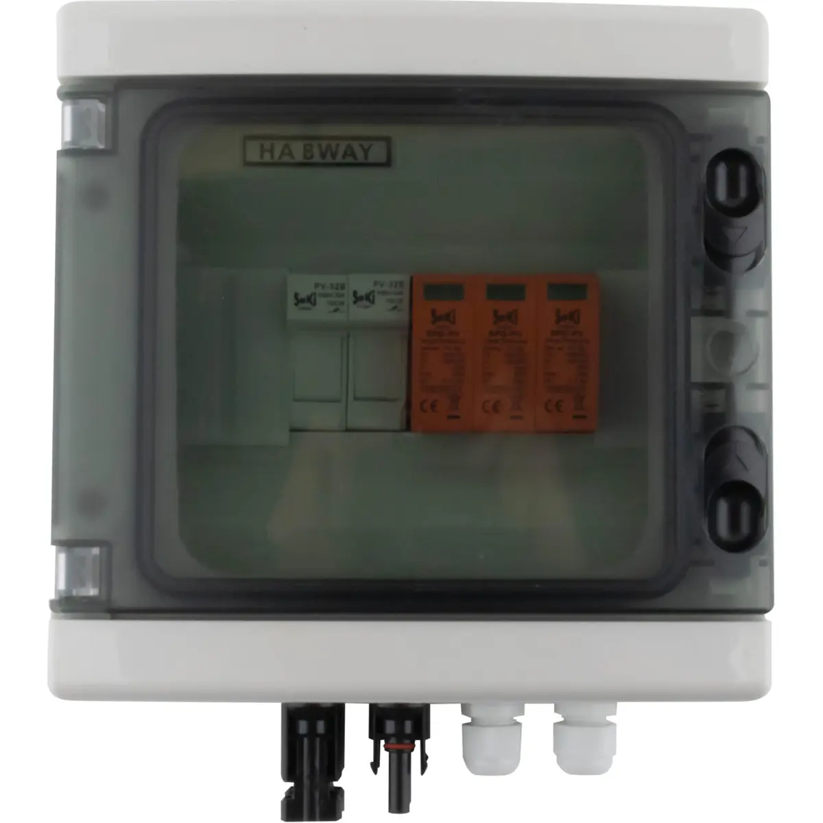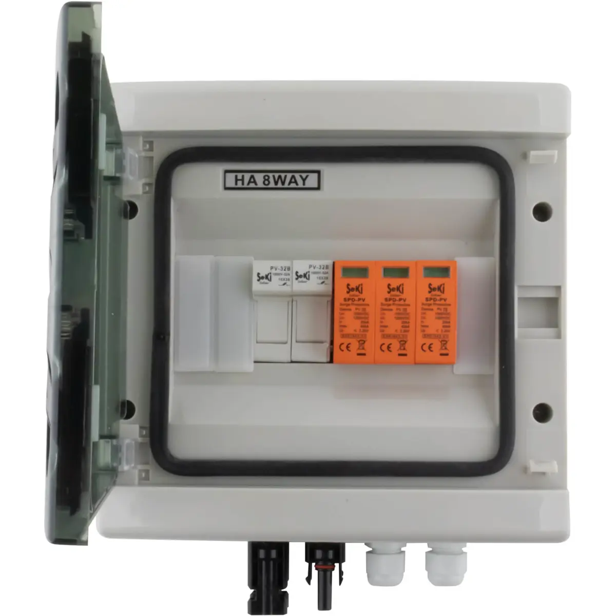 A caixa combinadora solar vem completamente montada e ligada, incluindo prensa-cabos, fusíveis solares de 16A 10x38mm, conectores compatíveis com MC4, tampas de borracha e kit de montagem.