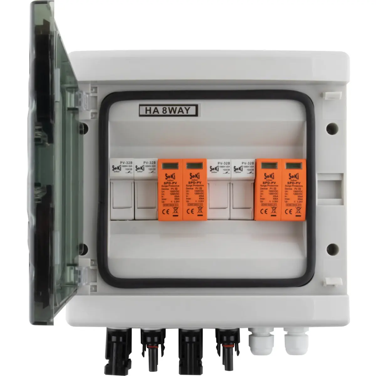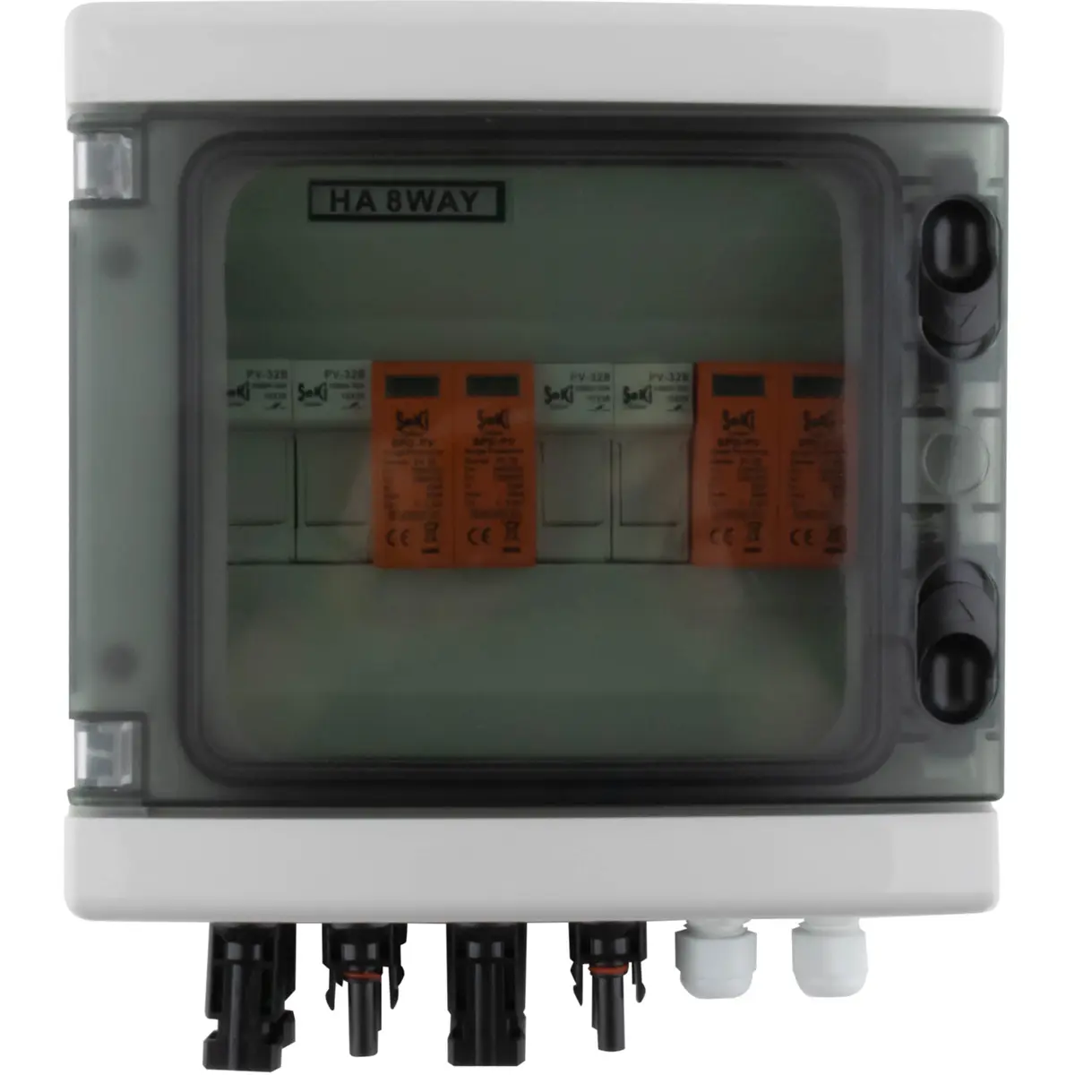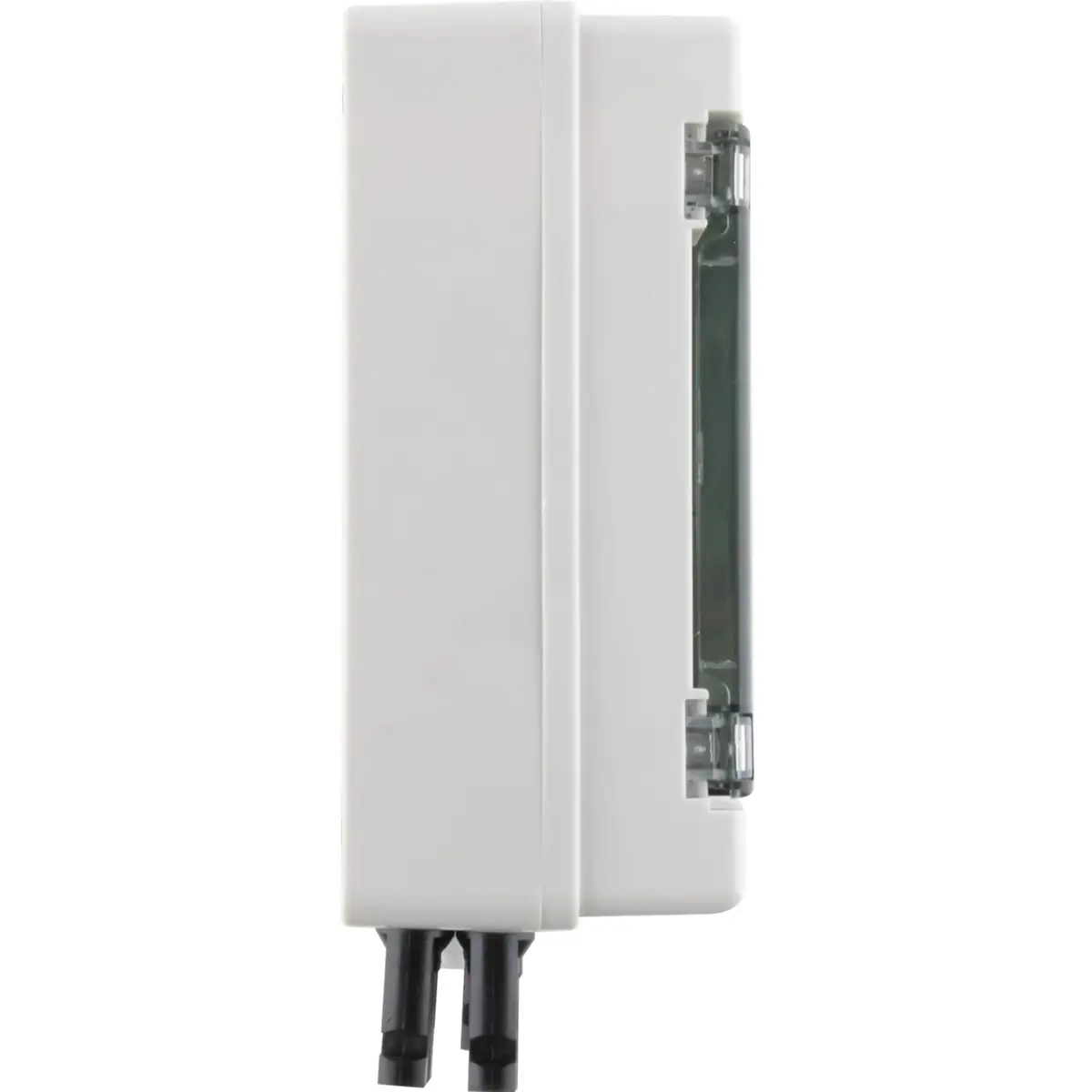 Caixa combinadora IP65 para sistemas fotovoltaicos com proteção contra sobretensão DC até 1000 V e classe T2. Deteta sobretensões nos polos positivo ou negativo para proteger o inversor contra falhas elétricas causadas por raios, EMI e comutações. Suporta até 1060 V DC de carga, com descargas de 20 kA (In) e 40 kA (Imax), e Vp até 3,8 kV. Vem pronta a montar com prensa-cabos, porta-fusíveis 1000 V 16 A, conectores MC4, tampas de borracha e kit de montagem; ideal para duas linhas e até 8 módulos.