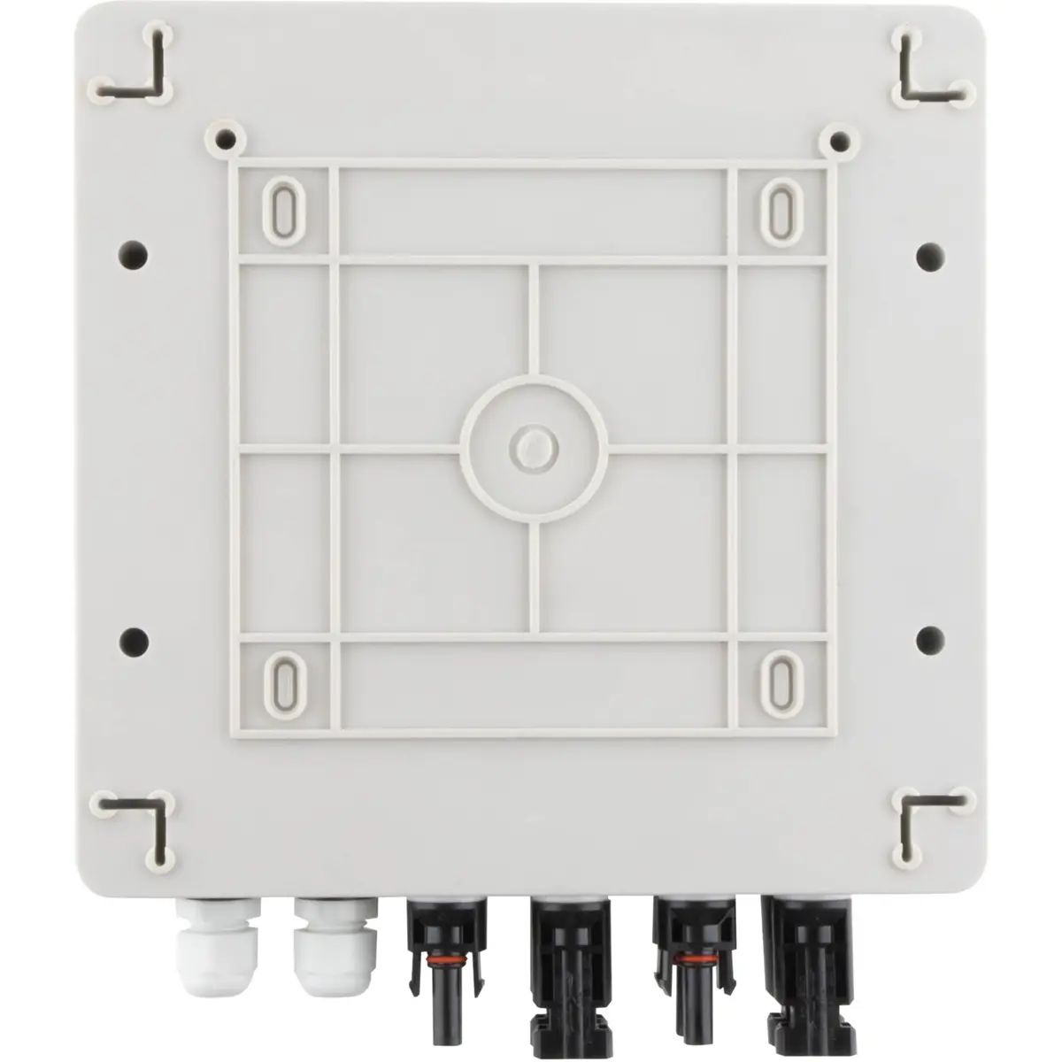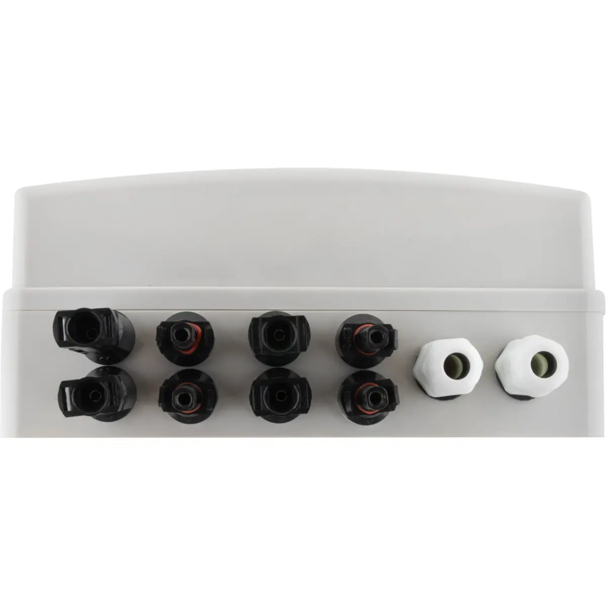A caixa combinadora solar vem completamente montada e ligada, incluindo prensa-cabos, fusíveis solares de 16A 10x38mm, conectores compatíveis com MC4, tampas de borracha e kit de montagem.
