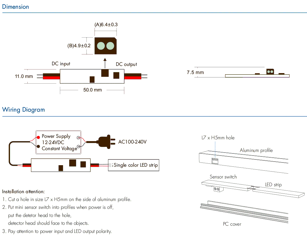 Interruptor/Dimmer com sensor (sem contacto) para fitas LED de uma cor, 12/24VDC 4A, para perfis de alumínio em roupeiros ou outros tipos de armários.