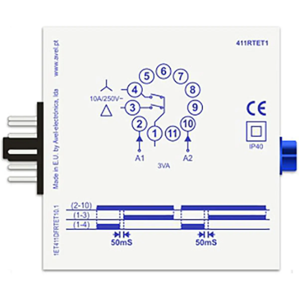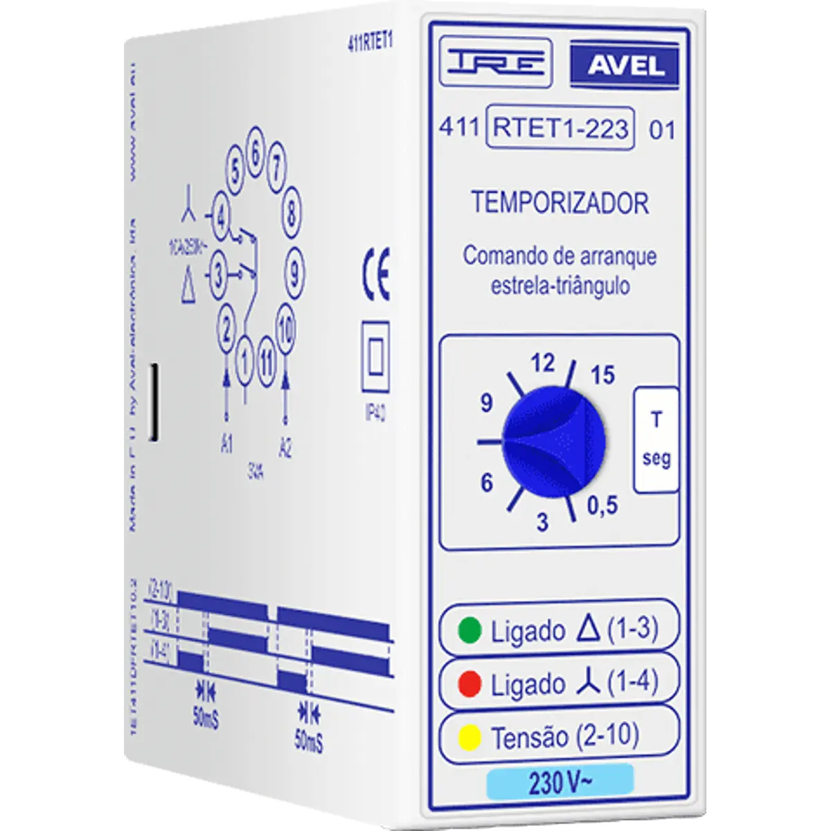 Temporizador para arranque estrela-triângulo de motores trifásicos, com tempo regulável de 0.5 a 15s e intervalo de segurança de 50ms entre a ligação estrela e a ligação triângulo.