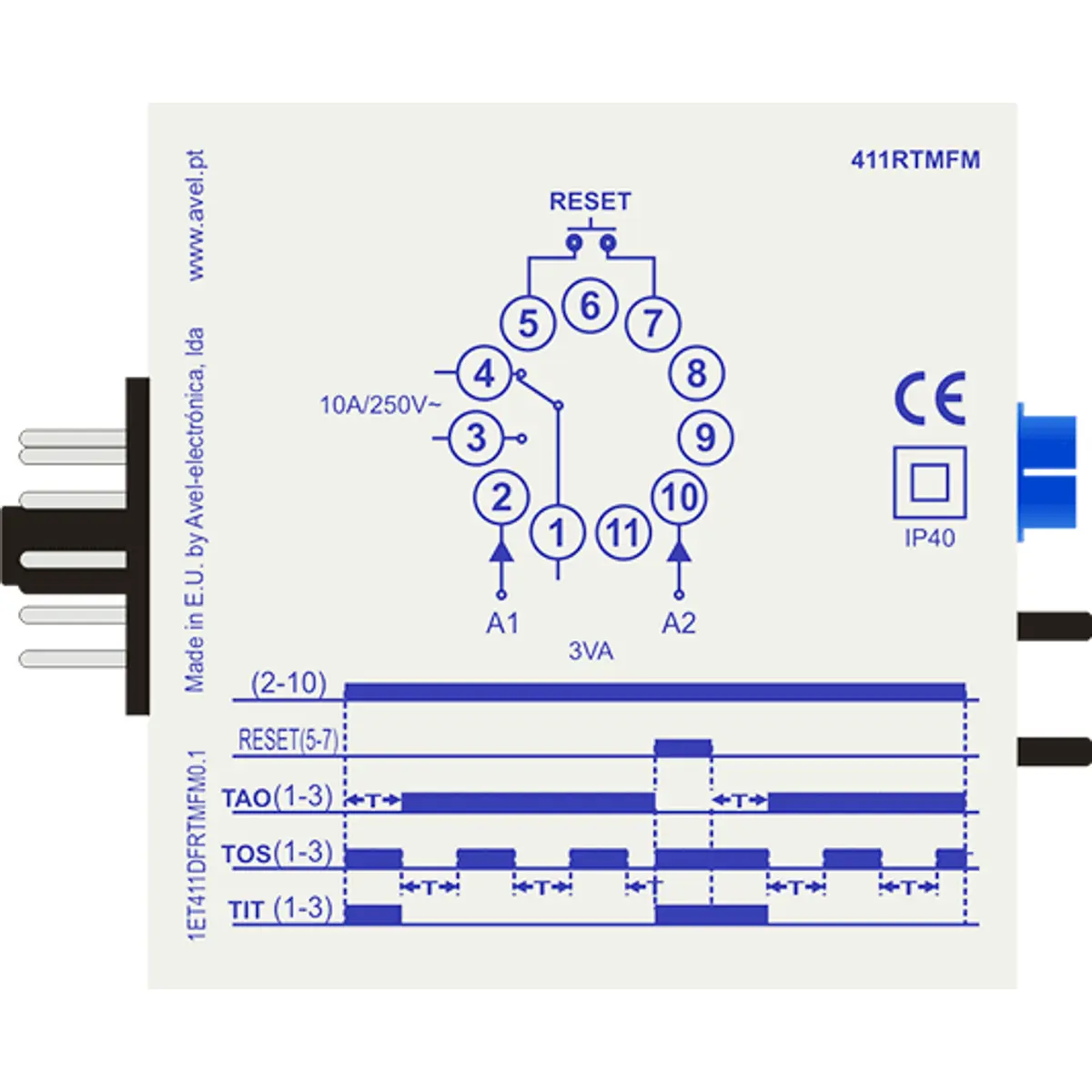 Temporizador com 3 modos de funcionamento (TAOM+TOSM+TITM), multi-escala (de 0.2 min até 60 horas) e tensão de alimentação de 230VAC.