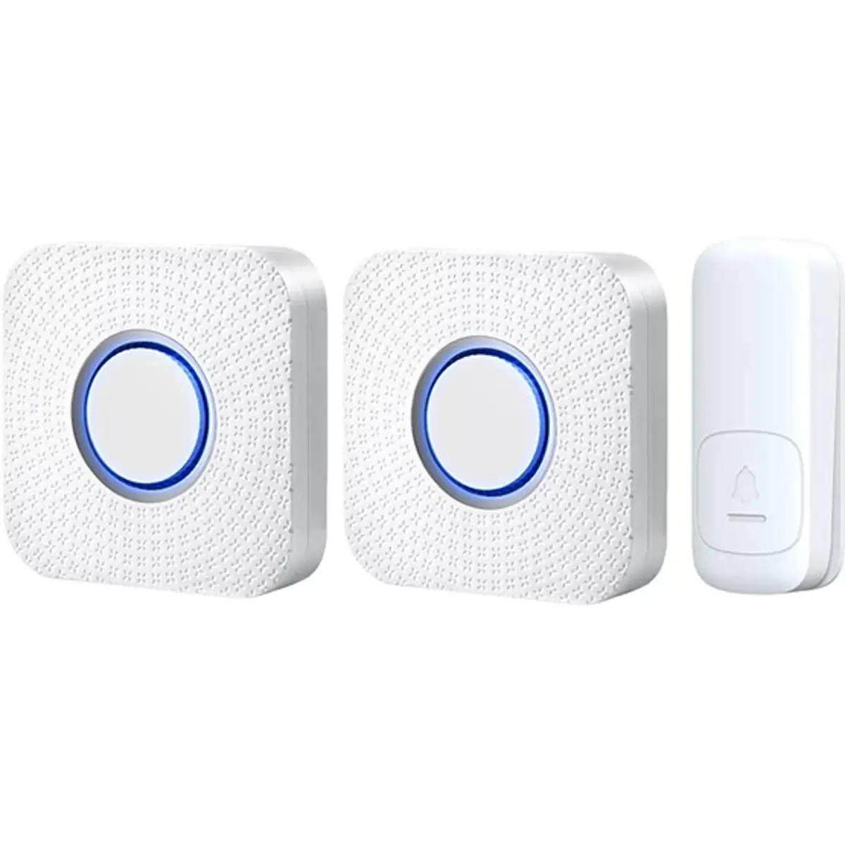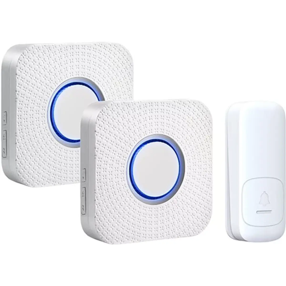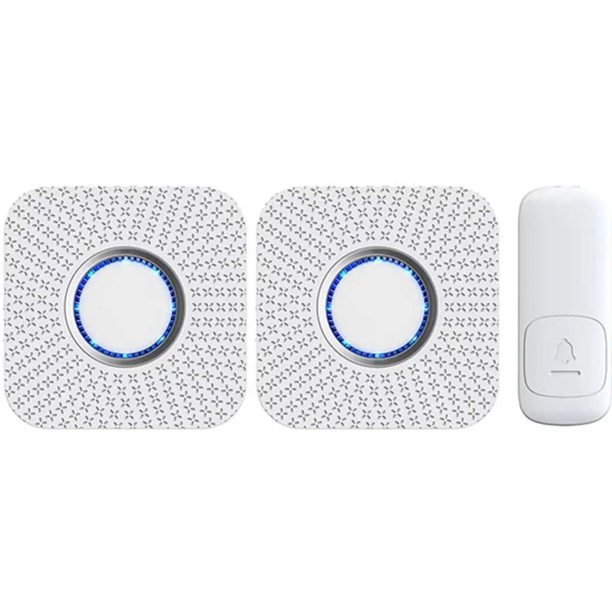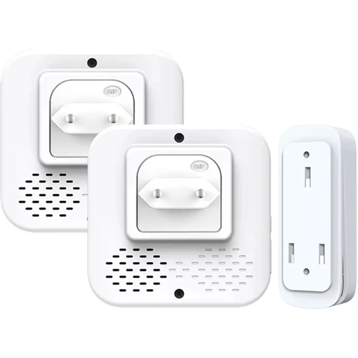 Conjunto de campainhas sem fios com botão auto-alimentado, concebido para ambientes domésticos, escritórios e espaços modernos. Em espaço aberto, o sistema atinge alcance até 150 m com transmissão a 433 MHz. Possui 58 melodias, 5 níveis de volume (0-110 dB) e consumo inferior a 1 W. O botão não requer pilhas e funciona com energia cinética; instalação simples com emparelhamento automático e código de aprendizagem para ligar vários botões e campainhas. Proteção IP20, alimentação da campainha em 230 V AC/50 Hz, cor branca.