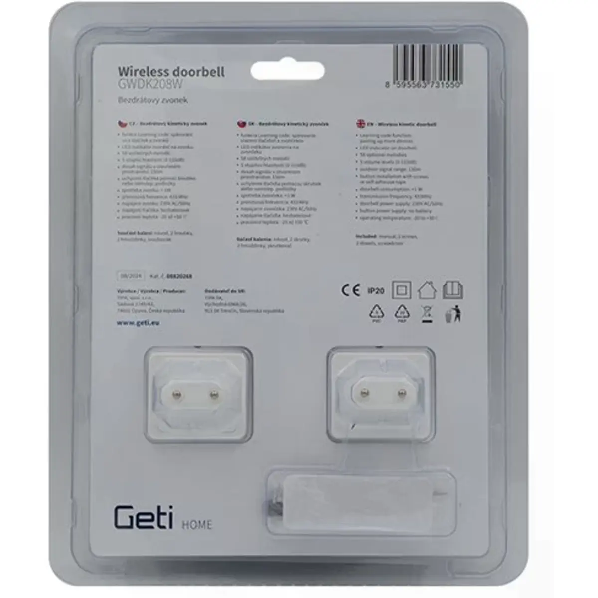 O conjunto de 2 campainhas e 1 botão GETI GWDK208W é adequado não apenas para casas ou apartamentos, mas também para escritórios, fábricas ou salas de receção. A principal vantagem é que o botão não necessita de pilhas ou alimentação externa, uma vez que a energia necessária para o seu funcionamento é gerada pelo movimento de pressionar o botão. Isto elimina a necessidade de substituição regular de pilhas, tornando-o uma solução ecológica e económica. Outra característica destacada desta campainha é o seu design sem fios com um alcance de até 150 metros em espaço aberto. A instalação da campainha é muito fácil, com o emparelhamento entre o transmissor e a campainha a ocorrer automaticamente. A função de LEARNING CODE (código de aprendizagem) permite ainda o emparelhamento de vários botões e campainhas. A campainha apresenta um design moderno e simples, 5 níveis de volume e uma seleção de 58 toques. Uma grande vantagem é que a campainha mantém a melodia e o volume definidos mesmo após ser desconectada da alimentação elétrica.