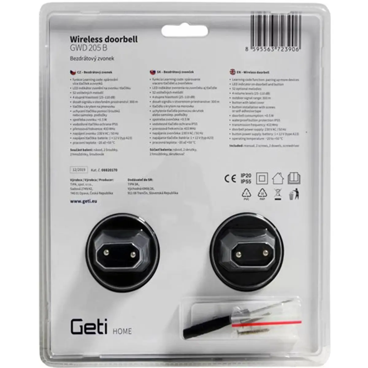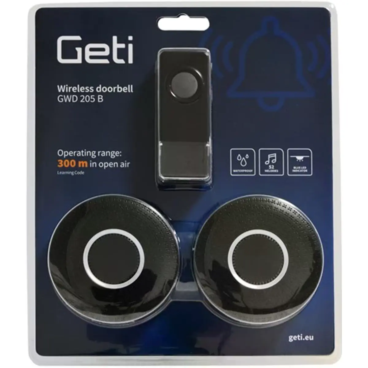 Conjunto de 2 campainhas e 1 botão GETI GWD 205 B é adequado não só para casas ou apartamentos, mas também para escritórios, fábricas ou salas de receção. A grande vantagem destas campainhas é o seu design sem fios, com um alcance de até 300 m em espaço aberto. A instalação das campainhas é muito fácil, o emparelhamento entre o transmissor e a campainha é feito automaticamente. Além disso, a função LEARNING CODE permite emparelhar vários botões e campainhas. Não precisa de se preocupar com o tempo chuvoso, pois o botão transmissor com indicação LED é à prova de água. As campainhas têm um design simples e moderno, 4 níveis de volume, uma seleção de 52 toques e uma luz indicadora LED. A grande vantagem das campainhas é que elas memorizam a melodia e o volume definidos, mesmo depois de serem desconectadas da rede elétrica.