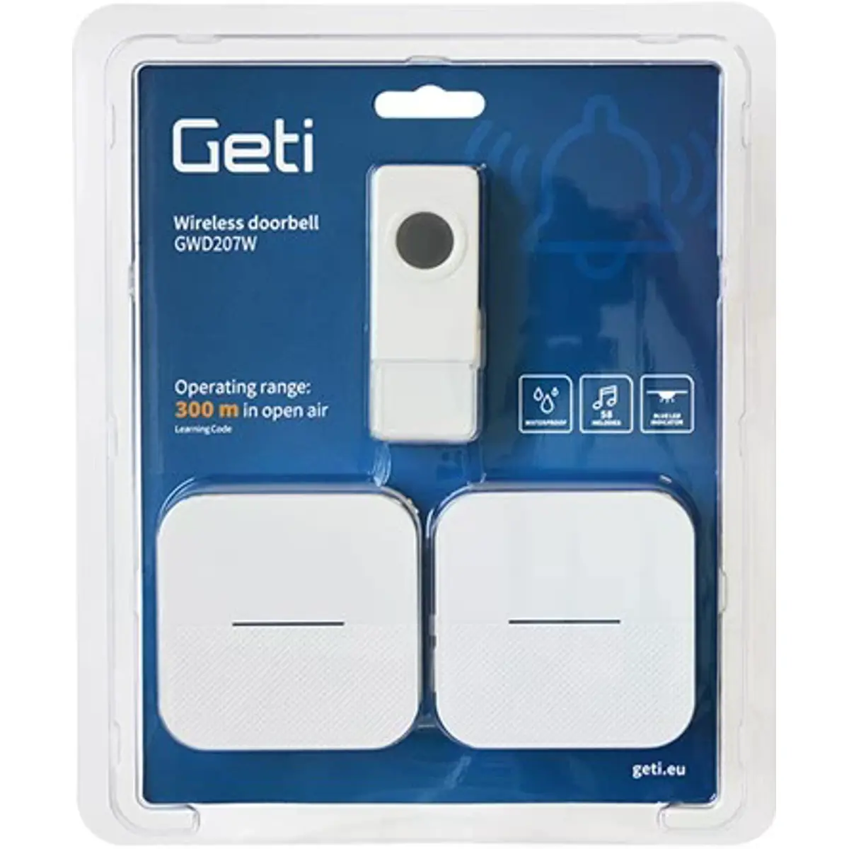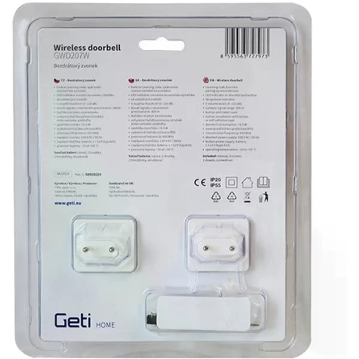O conjunto de 2 campainhas e 1 botão GETI GWD207W é adequado não apenas para uma casa ou apartamento, mas também para escritórios, fábricas ou salas de recepção. A grande vantagem dessas campainhas é seu design sem fio com alcance de até 300 m em espaço aberto. A instalação das campainhas é muito fácil, o emparelhamento entre o transmissor e a campainha é feito automaticamente. Além disso, a função LEARNING CODE permite que vários botões e campainhas sejam emparelhados. Não precisa se preocupar com tempo chuvoso, o botão do transmissor com indicação de LED é à prova d'água. As campainhas têm um design simples e moderno, 5 níveis de volume, uma seleção de 58 toques e uma luz de sinalização LED. A grande vantagem das campainhas é que memorizam a melodia e o volume definidos, mesmo depois de serem desconectadas da rede elétrica.