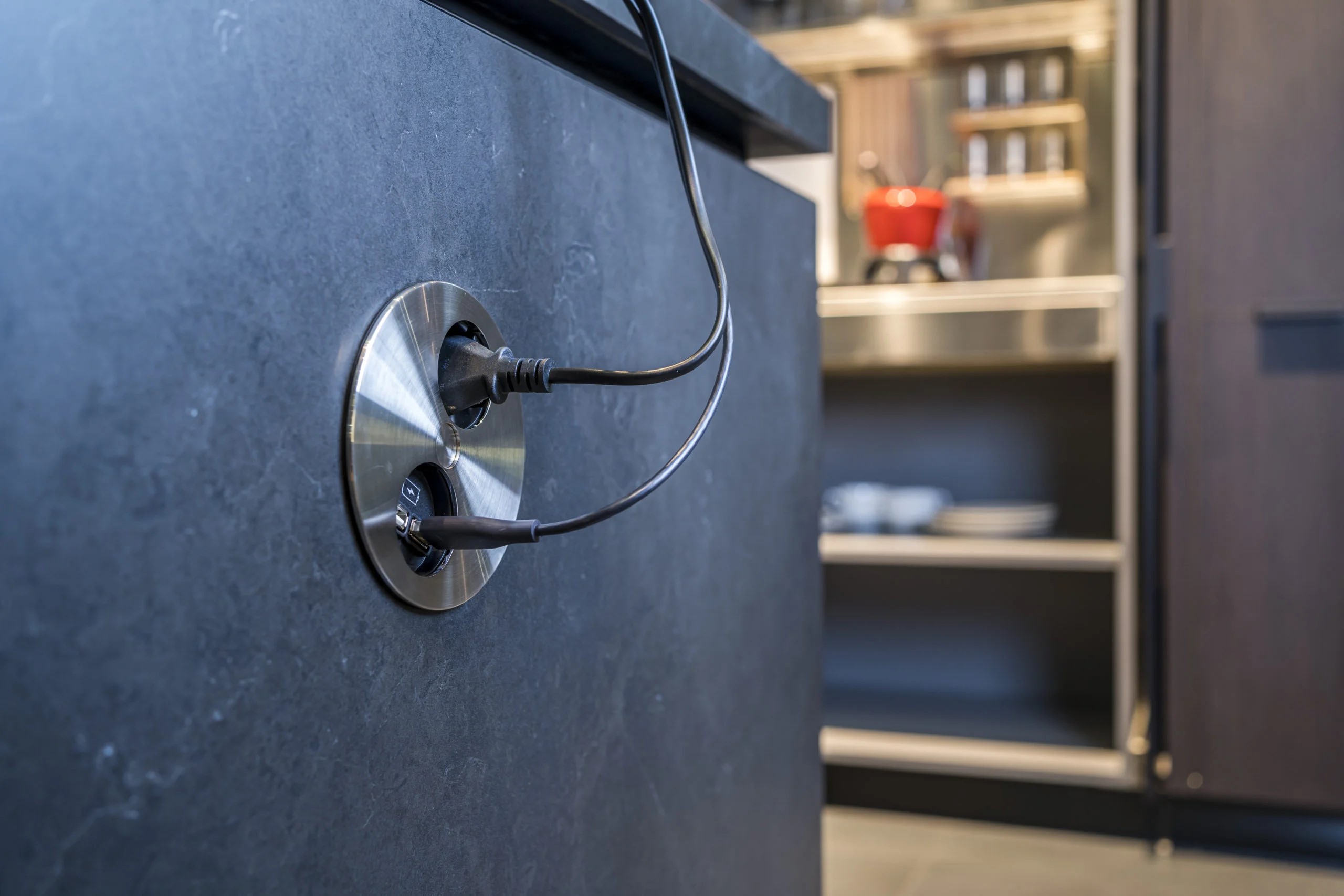 Graças a um mecanismo engenhoso, basta rodar a tampa após a utilização para ocultar totalmente as tomadas. Como o cabo de alimentação é encaminhado junto ao corpo do módulo, a profundidade de montagem é de apenas 40 mm, permitindo a instalação acima de gavetas, sem comprometer o espaço interior do móvel.