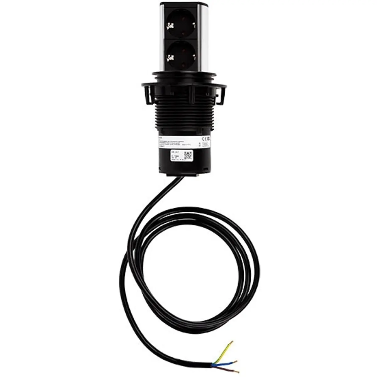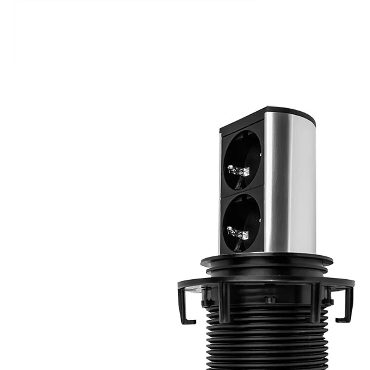 Módulo retrátil compacto, ideal para secretárias e mesas de trabalho com espaço limitado. Ativação por pressão e instalação simples em orifícios padrão de 79 mm.