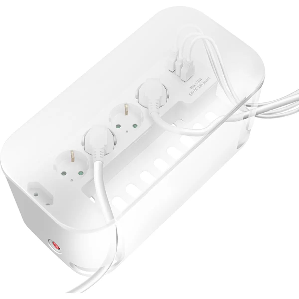 Caixa organizadora de cabos com régua de tomadas integrada, capaz de alimentar até 8 dispositivos a partir de uma única tomada. Possui portas USB (2x USB-A e 1x USB-C) para carregamento direto de smartphones e tablets, saídas em forma de L para organização flexível dos cabos, interruptor de energia iluminado e obturador de segurança. Fabricada em policarbonato, com classificação IP20, suporta 230 V em 50 Hz, até 16 A (3600 W máx.). Dimensões 28,5 x 14,5 x 13 cm; peso 1,02 kg. Ideal para casa ou escritório.
