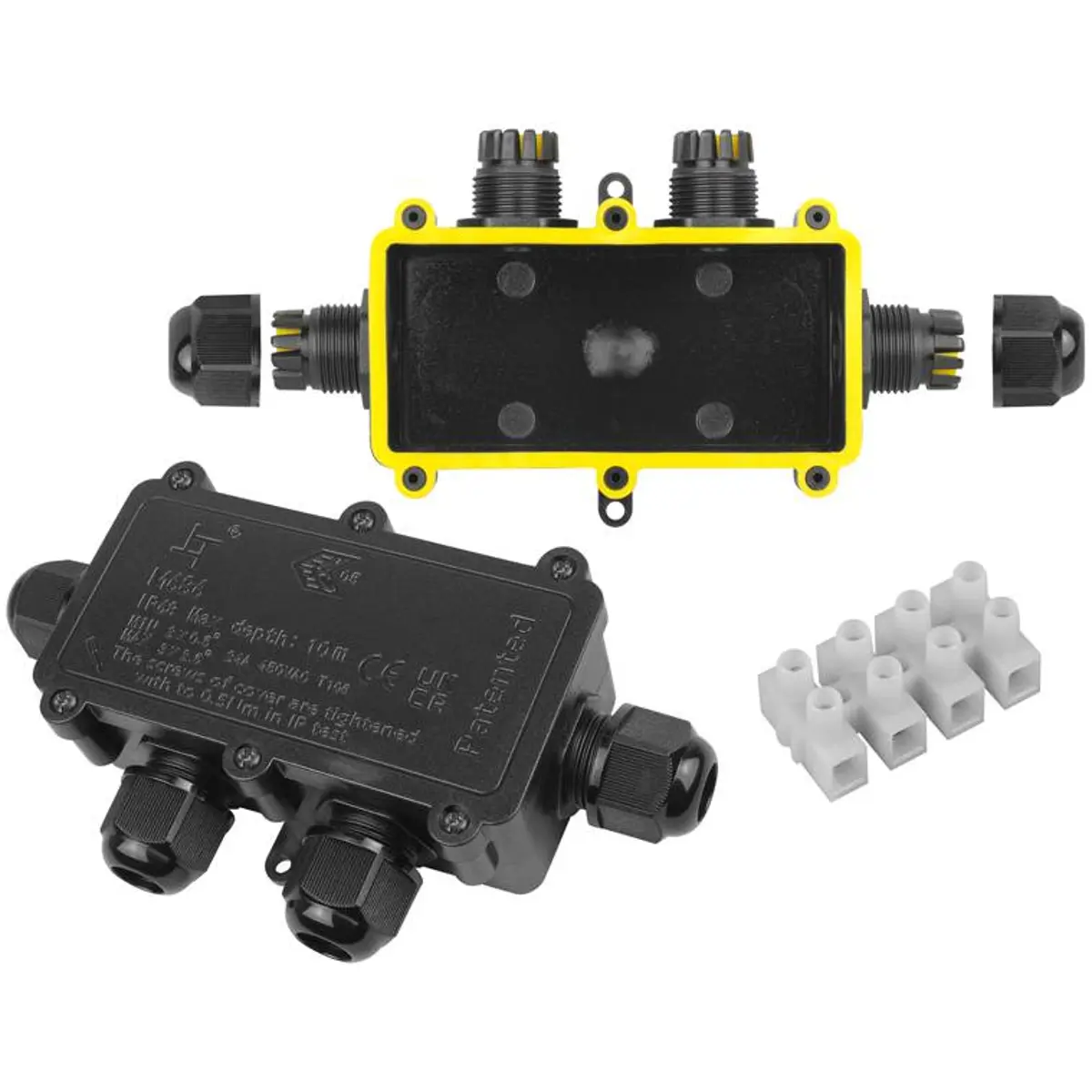 Caixa de derivação estanque de 4 vias, com grau de proteção IP68, indicada para instalações elétricas internas e externas. Possui 4 entradas para cabos, condutor até 2,5 mm², faixa de seção 0,5-2,5 mm² e diâmetro de cabo entre 4 e 8 mm. Suporta até 450 V e 16 A, com dimensões de 105 x 50 x 40 mm e certificação CE/RoHS.