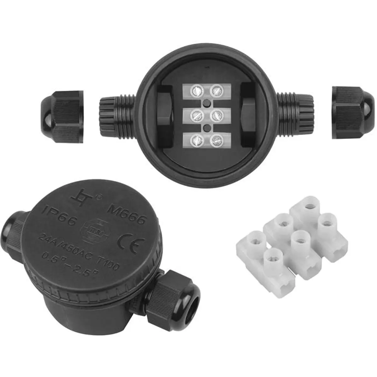 A caixa de derivação estanque, redonda, para instalação, oferece proteção IP66 para cablagem externa. Compatível com barra de 3 vias com terminais de parafuso, suporta cabos de 0,5 a 2,5 mm² e diâmetros de cabo entre 5 e 7,5 mm, com corrente máxima de 24 A e tensão máxima de 450 V AC. Com dimensões Ø60 x 50 mm e duas entradas para cabos, assegura montagem segura e proteção eficiente contra água e poeiras em ambientes externos.