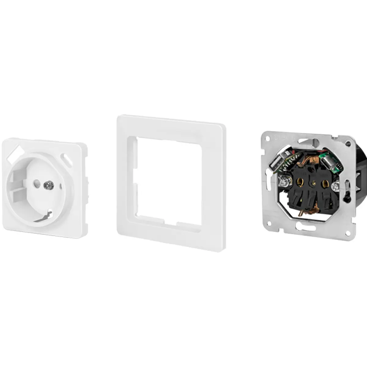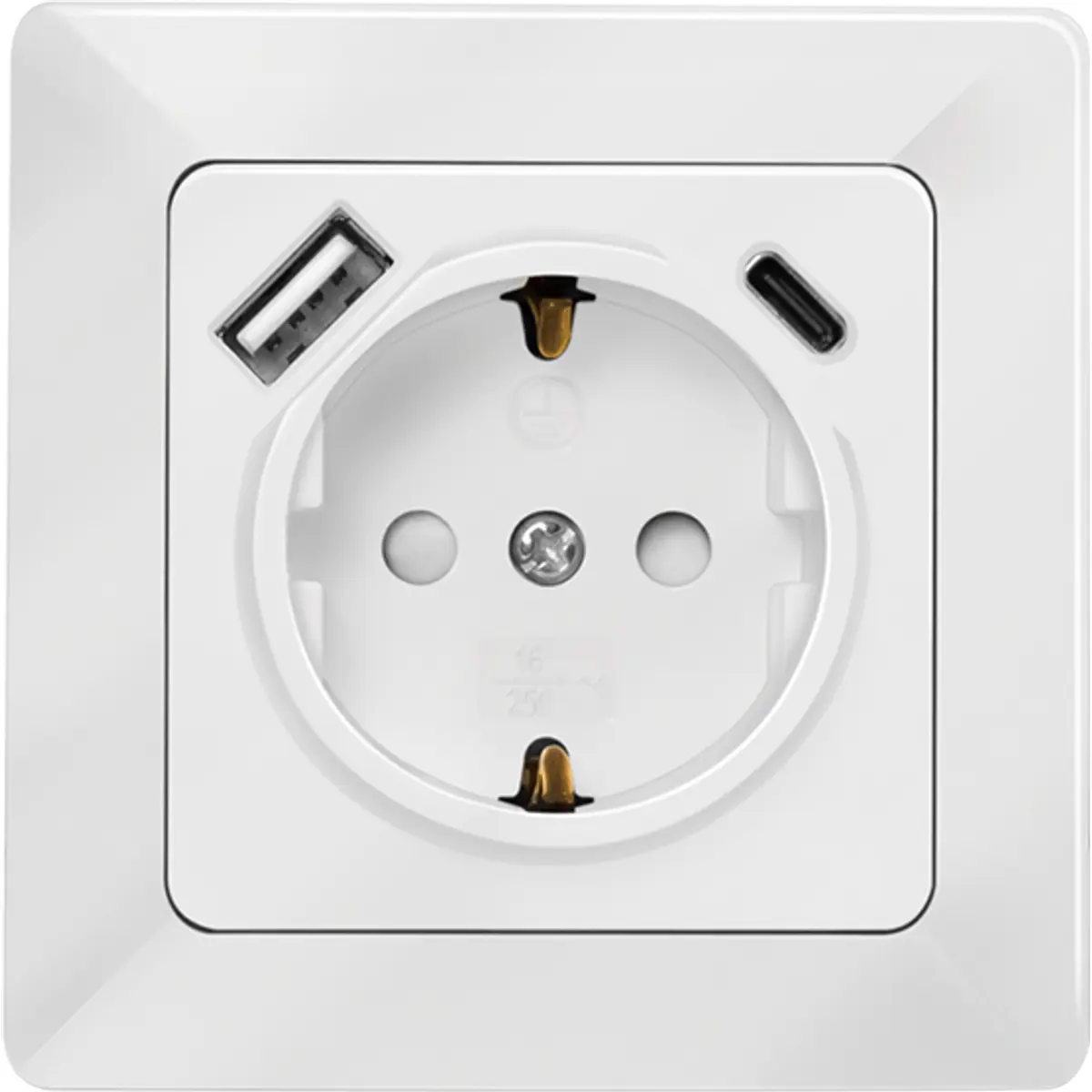 Tomada de embutir universal com USB-A (2,1A) e USB-C PD (até 18W) para carregamento rápido. Permite alimentar dois dispositivos USB em simultâneo sem comprometer o uso da tomada elétrica tradicional. Compatível com rede 230 V AC, 50 Hz, tipo de tomada alemão CEE 7/3 com obturador de segurança. Instalação fácil e discreta, ideal para hotéis, restaurantes, habitação e escritórios. A tomada branca combina com ambientes modernos, oferecendo carregamento eficiente e proteção integrada.