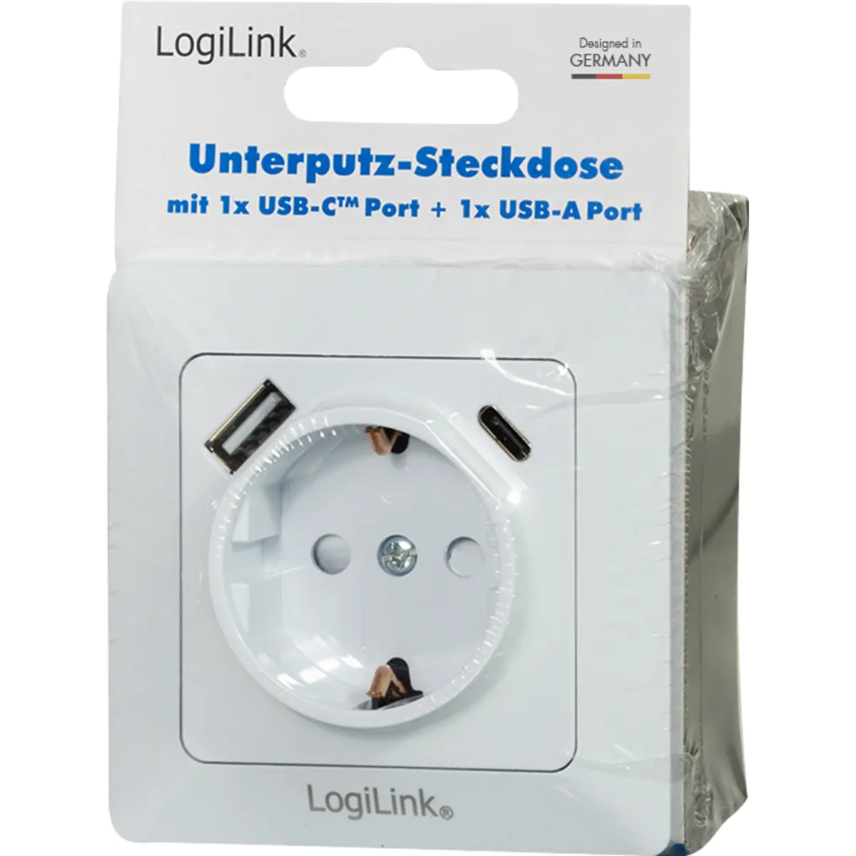 Logilink PA0253 - Tomada de embutir universal Schuko fêmea c/ USB-A 2.1A + USB-C 18W PD - Branco