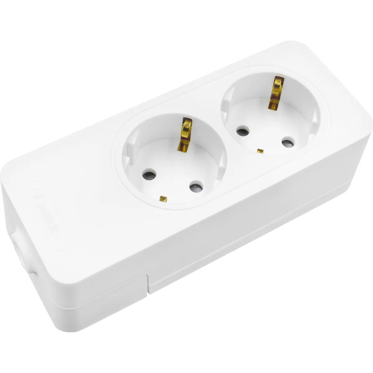 Bloco de tomadas com duas fichas Schuko para uso interior, sem interruptor e sem cabo. Funcionando a 230V, suporta 16A e até 3680W de potência. De cor branca, oferece uma solução prática para ligar vários dispositivos sem necessidade de alimentação com fio adicional, ideal para ambientes domésticos ou profissionais que requerem simplicidade e fiabilidade.